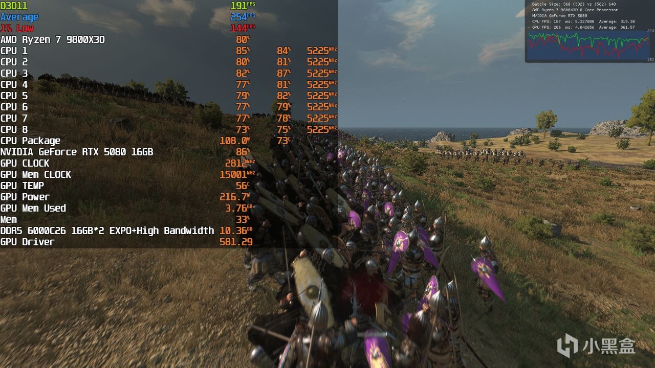 1080P《騎馬與砍殺2》預設非常高畫質,銳龍7 9800X3D+DDR5 6000C26 EXPO+技嘉D5黑科技+RTX 5080平均幀數爲254fps,1%LOW幀爲144fps