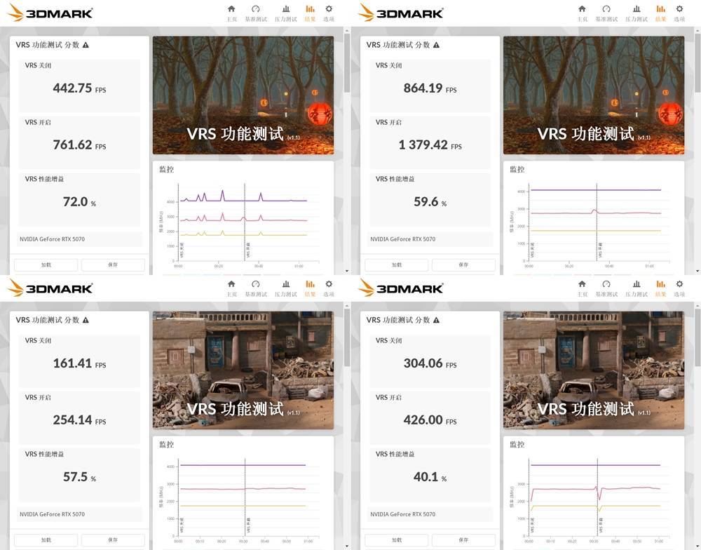VRS功能一级测试 二:VRS关闭 864.19 FPS、VRS开启 1379.42 FPS、性能增益59.6 %。