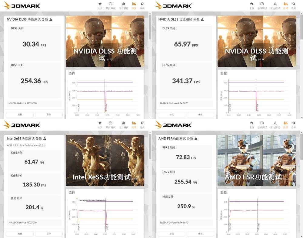 AMD FSR功能测试分数:FSR2关闭 72.83 FPS、FSR2开启 255.54 FPS、性能差异 250.9 %。