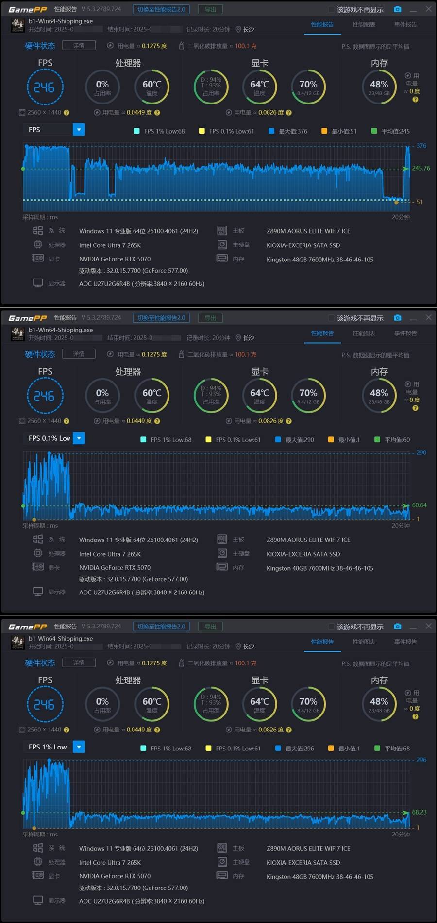 测试系统Windows 11,硬件搭配U7 265K、技嘉 Z890M AORUS ELITE WIFI7 ICE主板、Kingston FURY叛逆者 24G x2 7600MHz DDR5 CUDIMM 内存。