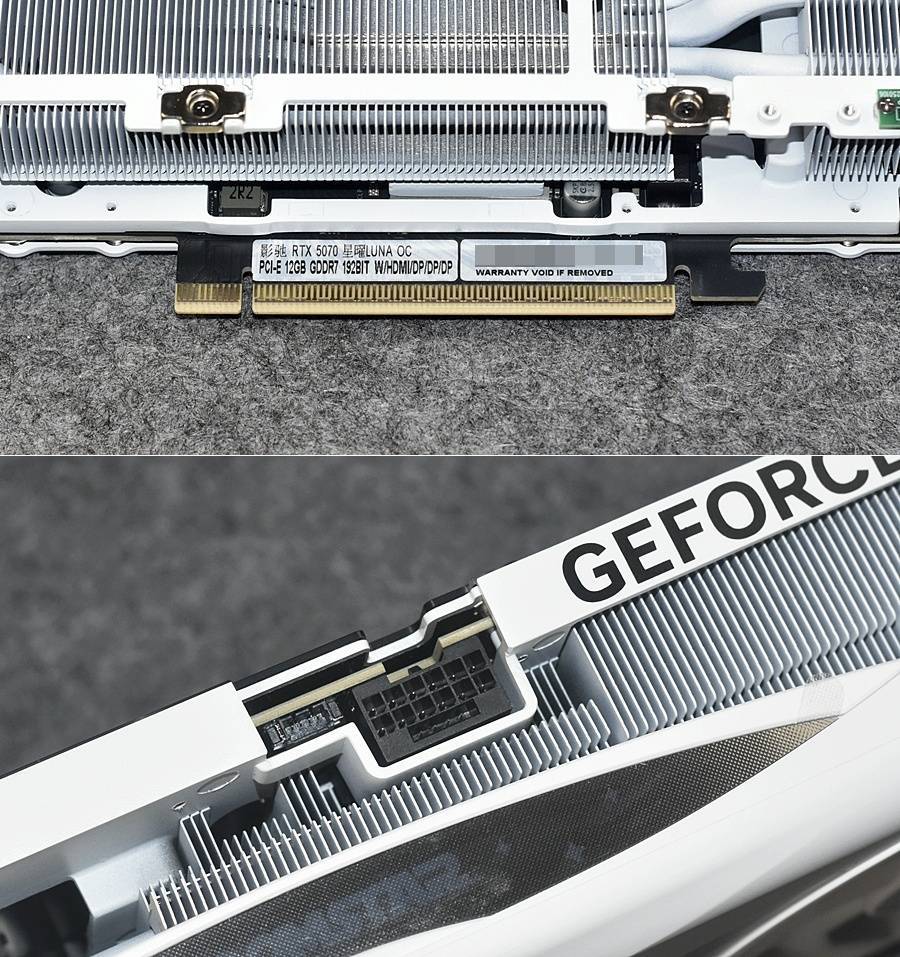 影驰RTX 5070 星曜LUNA OC金手指特写,支持最新PCIe 5.0 x16协议标准。金手指上方可以看到两个磁铁固定点位。