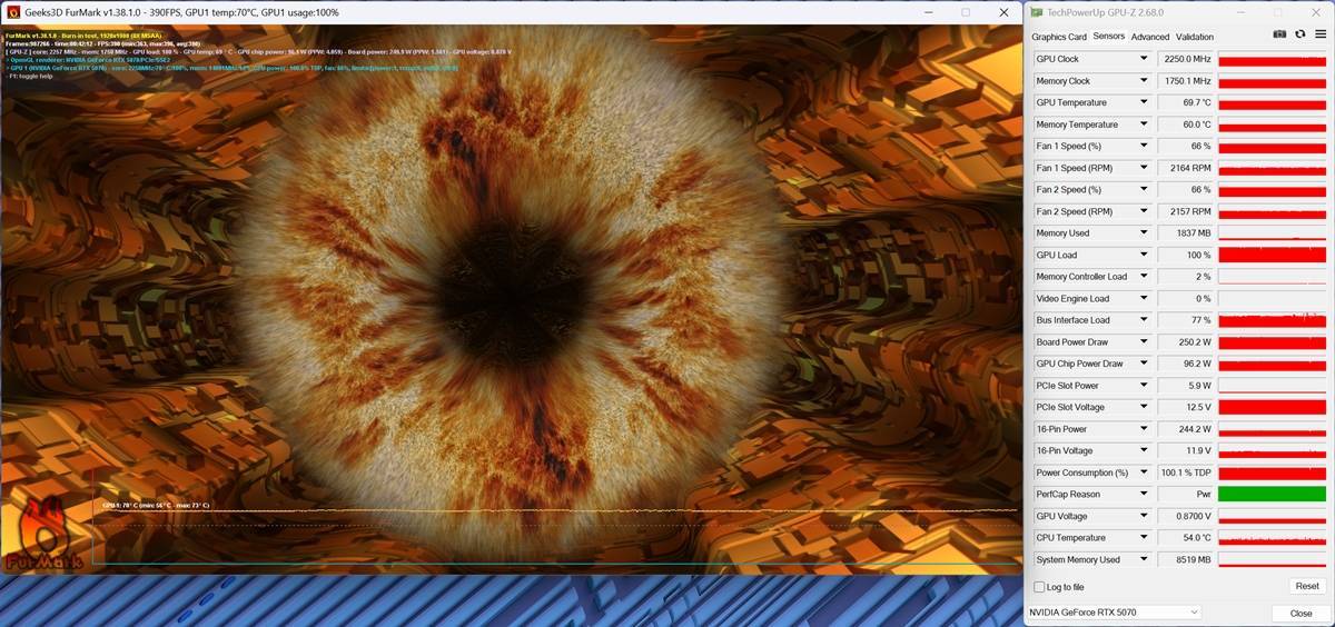 开放式环境,室温32度左右,TDP 250W,甜甜圈满负载运转42分钟,核心温度69.7度不超71度,显存温度60度,FAN 1风扇转速 2164 RPM,FAN 2风扇转速 2157 RPM,风扇使用率 66%。