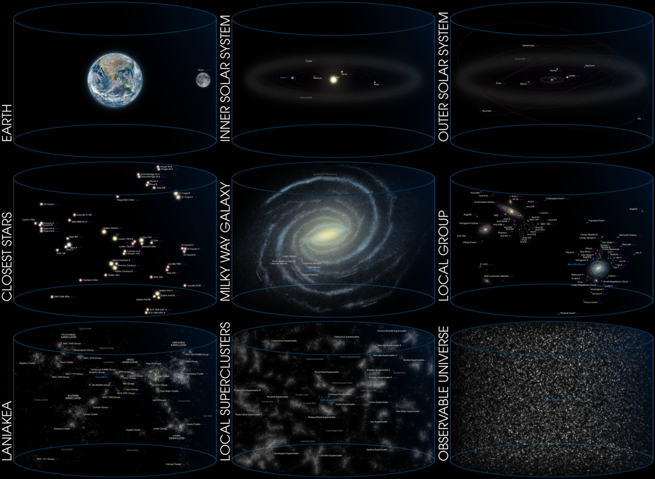 地球所处位置的天文结构尺度从左上到右下不断增大