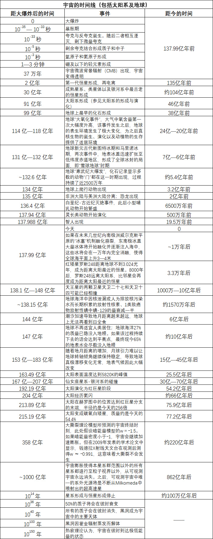 为了便于大家更直观地了解宇宙的演化史,我将百度百科中总结的资料放到了一张图里:
