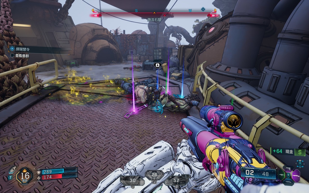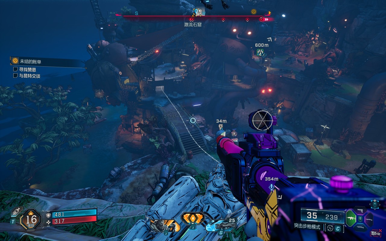 我們先傳送到如圖所示的位置,然後繞着指示的路線一路開車到了背後的山巔,從這裏下去之後能夠看到右手邊的位置有兩個機器,我們對準右側紫色的機器交互並且花費9400左右的錢就能夠刷新一次BOSS。