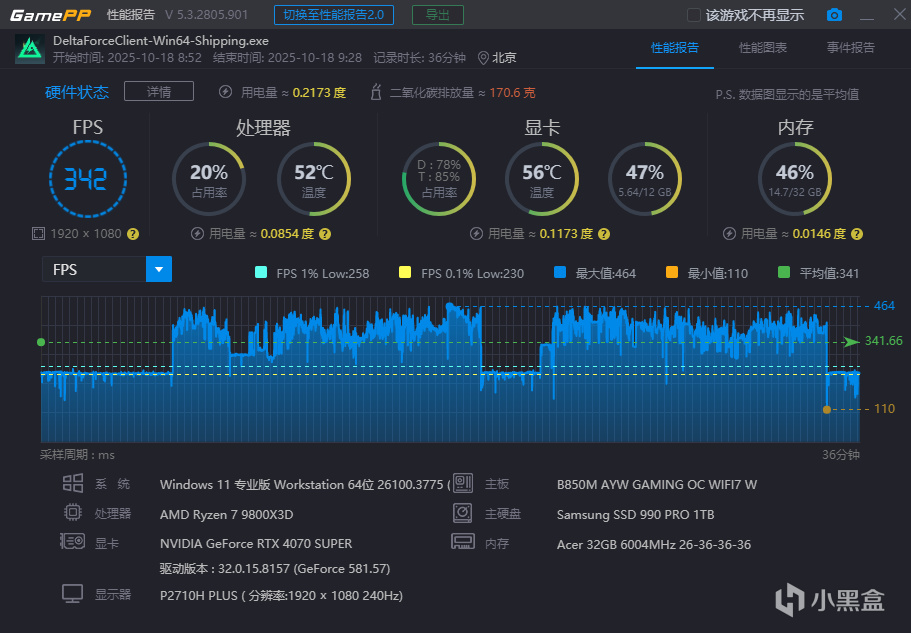 平均FPS 高达342FPS,1% Low 高达258 FPS,0.1% Low也高达230FPS 。