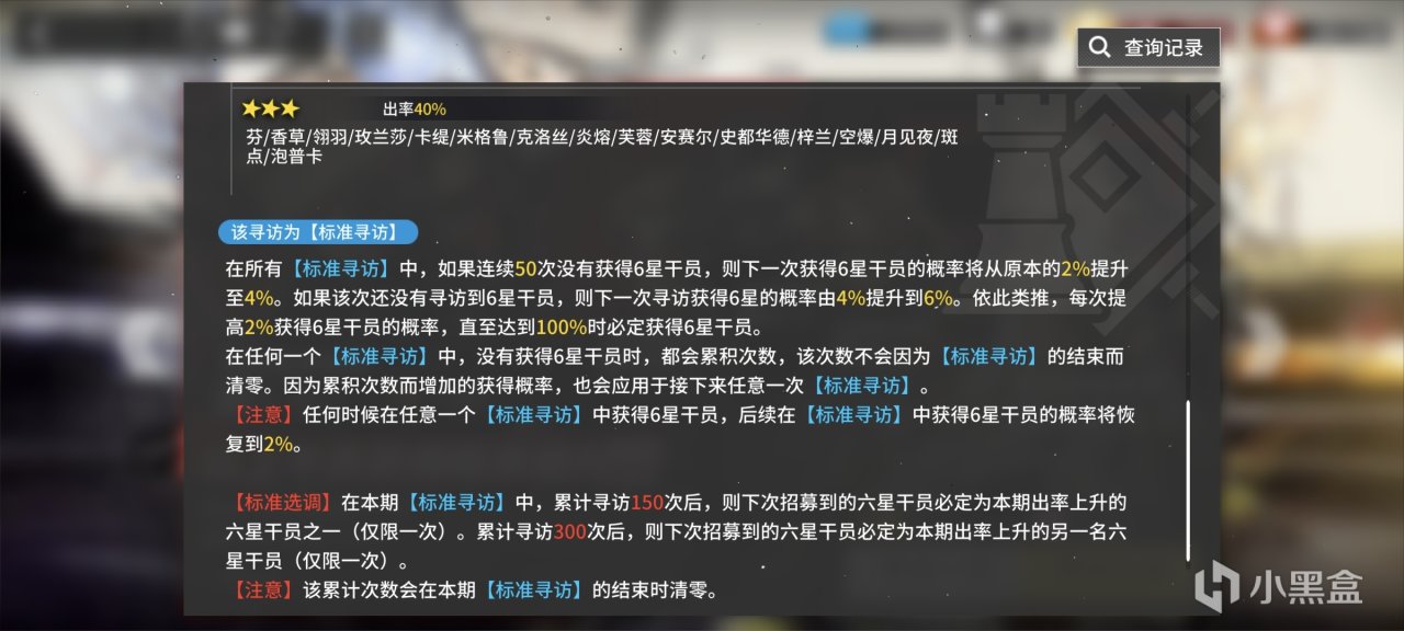 如圖是方舟的標準招募:百分之二的出貨率,五十抽後逐增百分之二直到百保六星,期望在個三十五抽左右。要保底當期UP則是一百五十抽後的事,換成限定這個保底則來到了三百抽