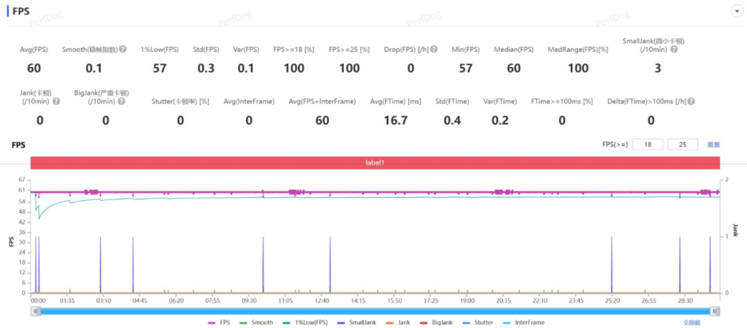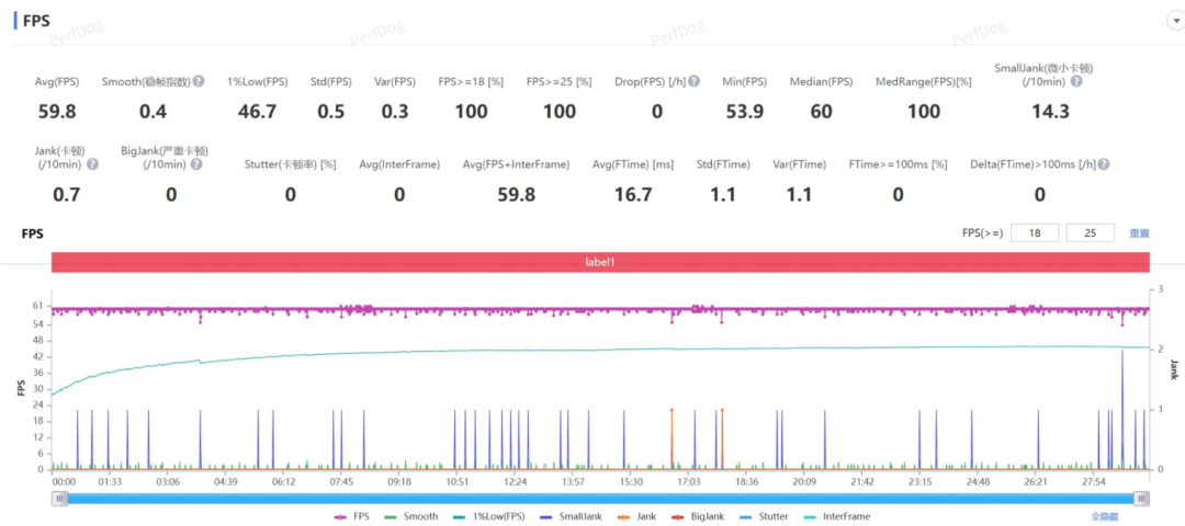 从 Perfdog 测到的数据来看,这次的帧率相较于原神须弥城来说,确实是有了些小的波动,不过平均帧依然稳定在 59.8 帧 ,还是有点东西的。