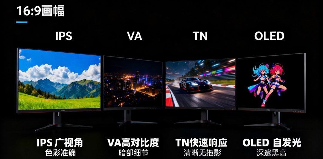 目前市場上的顯示器面板主要分爲IPS、VA、TN、OLED四大類型,各有鮮明的技術特點和適用場景。