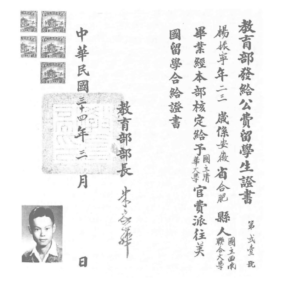 1942年,20岁的杨振宁从联大毕业,随即进入清华大学研究院攻读硕士。他的才华得到了清华物理系主任叶企孙的极高评价。在叶先生的全力支持下,他获得了宝贵的“庚子赔款”留美奖学金(是20世纪初美英等国将《辛丑条约》规定的不平等赔款部分退还给中国,并限定用于文化教育事业的举措。),成为了全国物理专业惟一被录取的留美生。