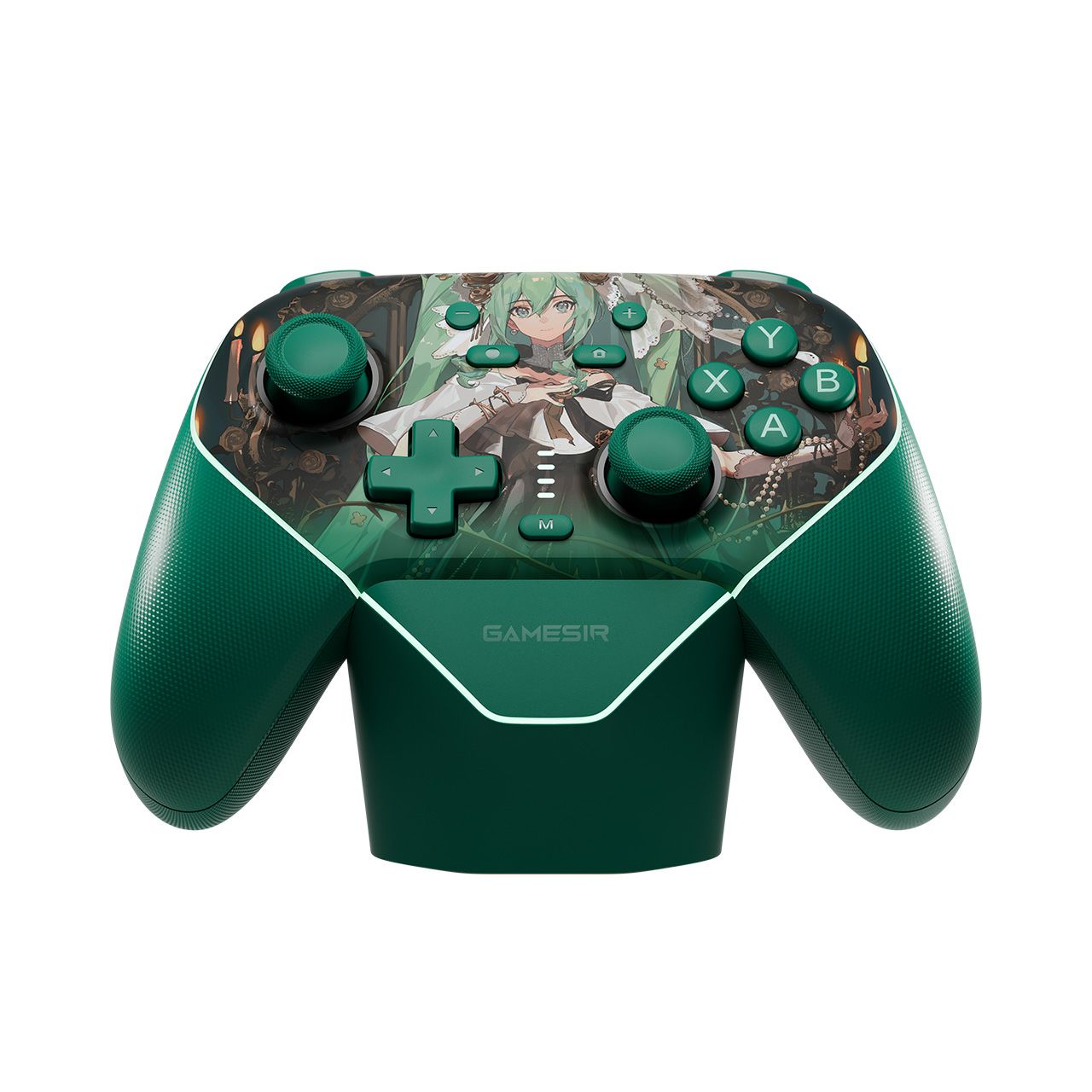 由于这款手柄的主题是初音未来18周年生日庆典,因此在配色上也采用了《发条夜莺》主题墨绿色配色,并且面壳上印有我们熟悉的公主殿下。只见初音未来身披华丽礼服,置身于绚烂舞台之中,玫瑰、蜡烛与金丝绒幕布交织出生日庆典的隆重氛围。