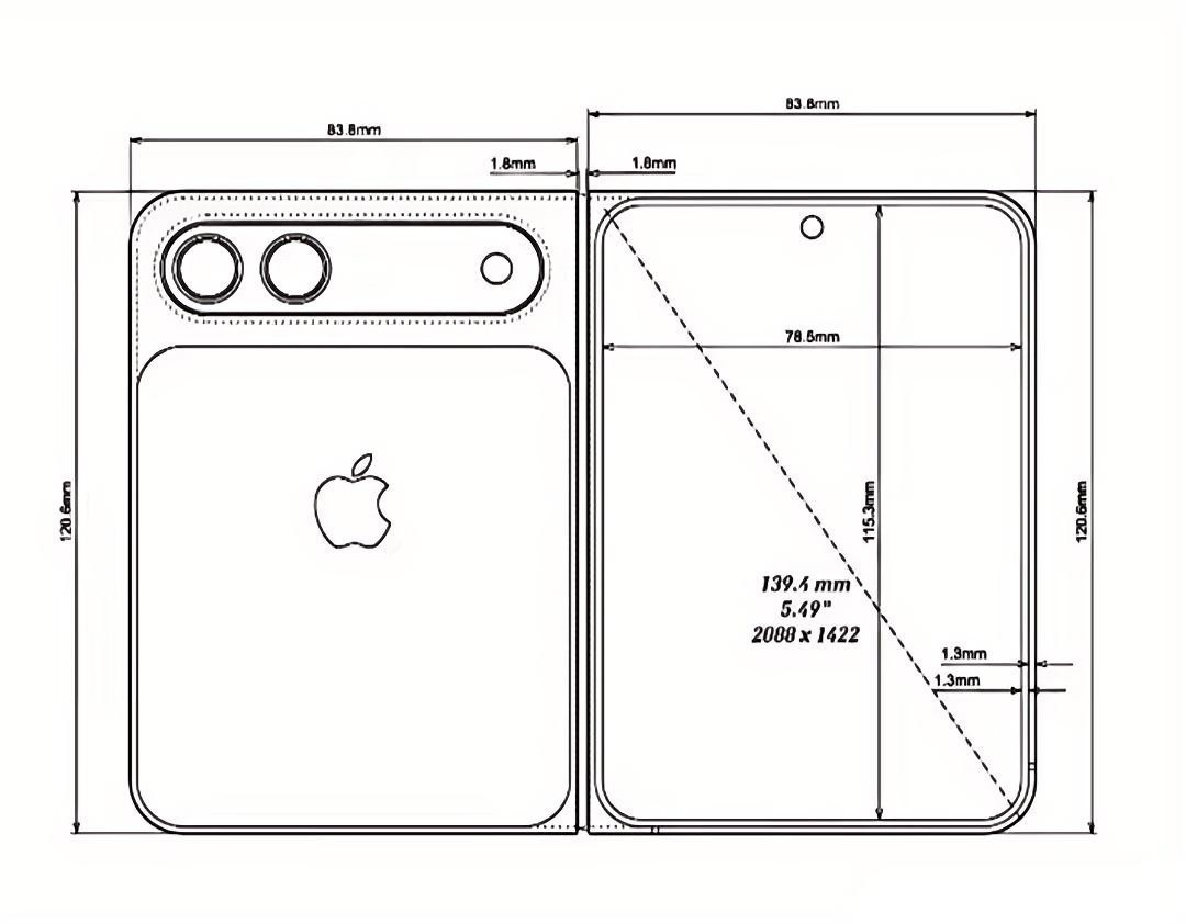 苹果首款折叠屏手机采用和华为PuraX一样的折叠内屏+外屏的设计,区别在于PuraX外屏和后置摄像头布局在一起,苹果折叠屏外屏则设计在另外一侧。华为PuraX设计的好处在于可以利用后置摄像头拍摄,外屏无需单独配备一个摄像头;苹果设计的好处在于可以装下更大的外屏,PuraX是外屏为3.5英寸,而苹果折叠屏手机的外屏达到了5.49英寸,但由于无法共享后置摄像头,外屏需要额外增加一颗摄像头。
