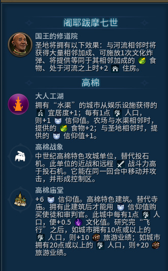 1.擁有水渠的城市從娛樂設施獲得+1宜居度,每有1人口+1信仰值。