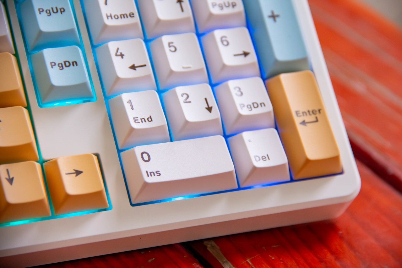 這套海鹽配色的三拼色PBT正刻鍵帽,比較務實。沒漸變側刻那麼花裏胡哨,反而更合適辦公。