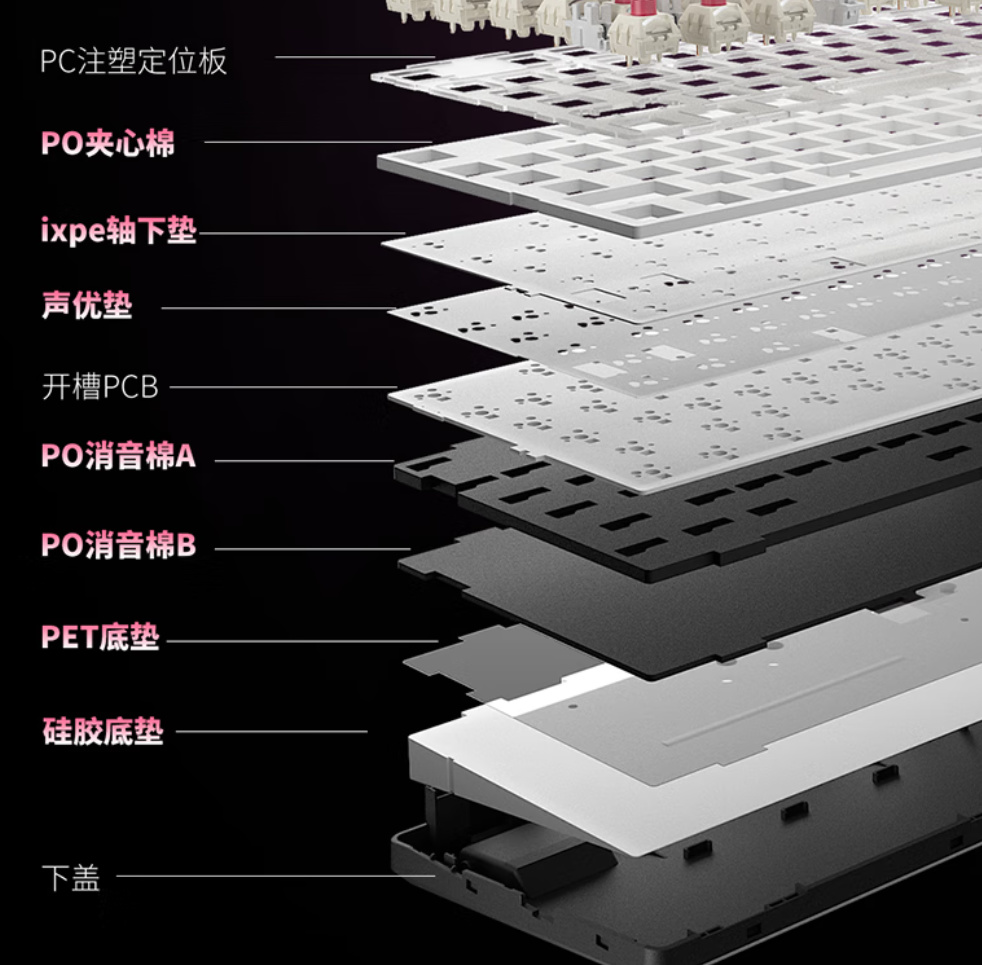 一共7層(目前機械鍵盤第一梯隊,一般稱之爲“滿填充”)——PORON夾心棉、IXPE軸下墊、聲優墊、兩層PORON消音棉(A+B)、PET底墊、硅膠底墊。