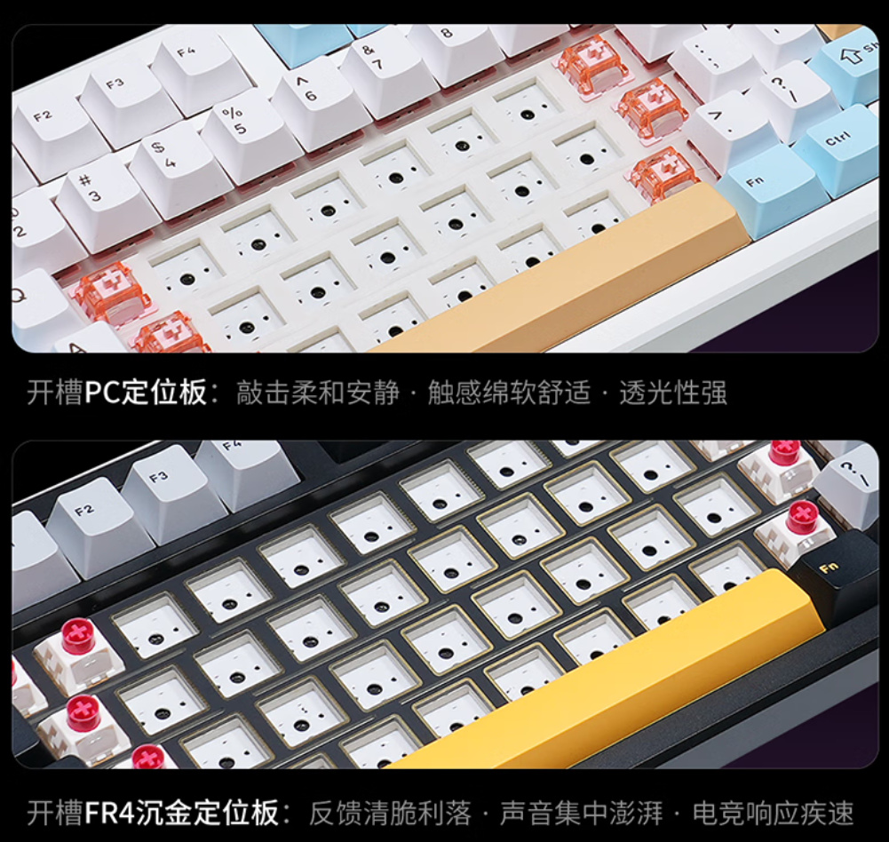 定位板有PC定位板和FR4沉金定位板兩種選擇,PC定更軟、透光更好,FR4定反饋更爽脆、聲音更集中。