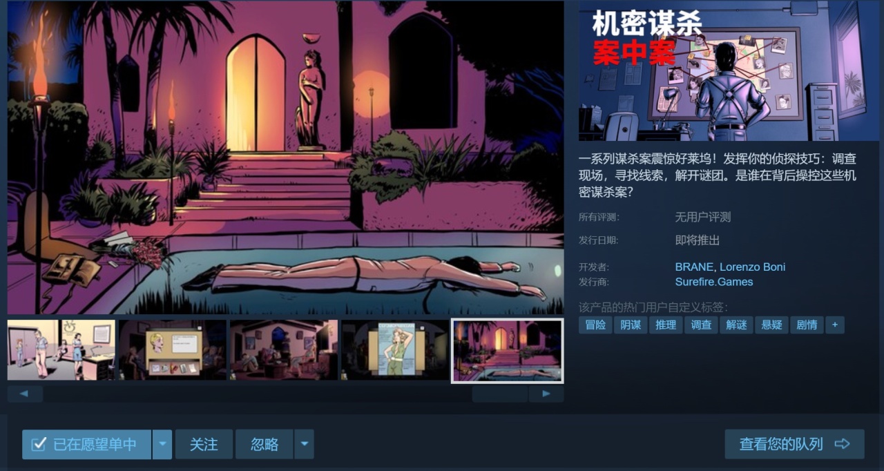 本格推理爱好者直呼太过瘾了,玩家在游戏中调查现场、整理线索、解开谜题、破解谋杀案的真相。画风属于漫画风。解谜难度不大,但是设计十分精巧,非常期待后续章节的剧情。demo给我一种阿加莎的风格哈哈。