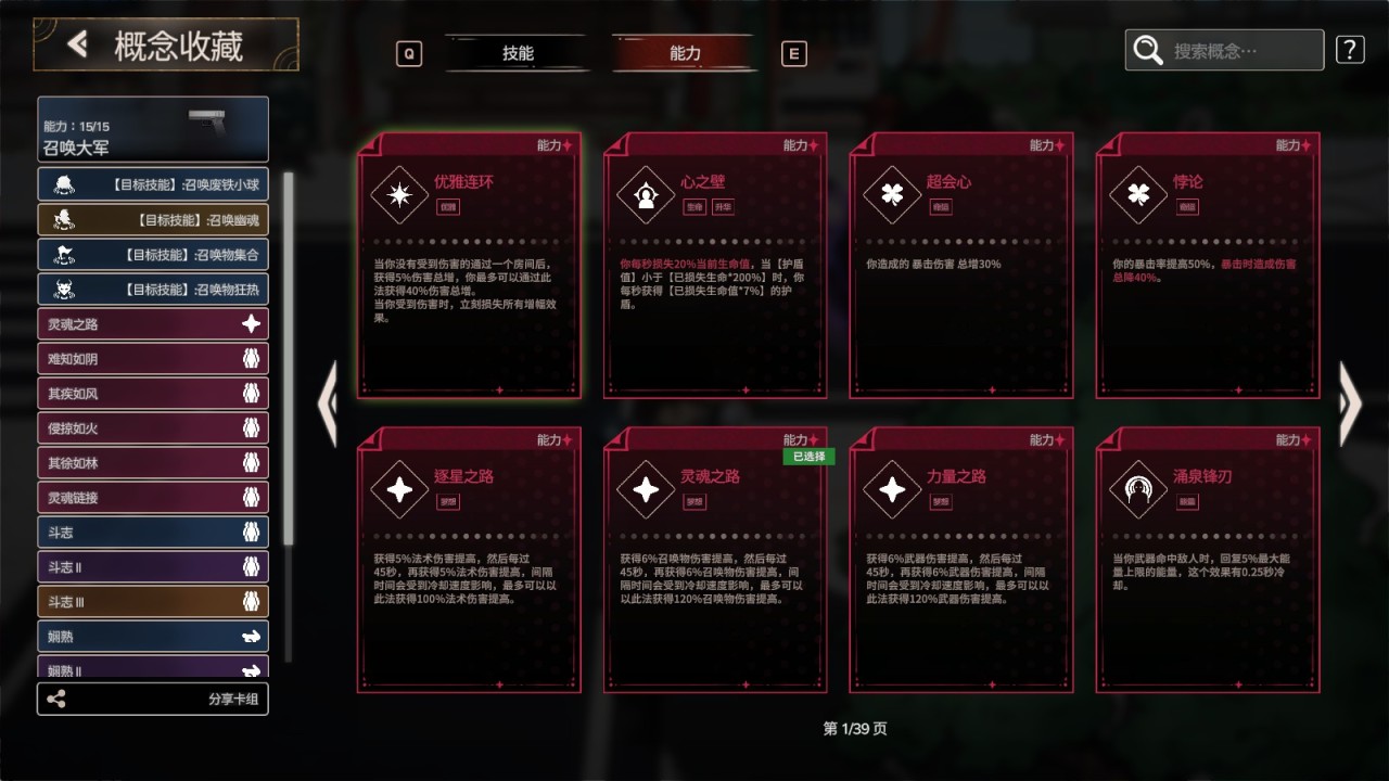 Demo版本开放5级难度、22把武器、64种技能和309个能力,卡组搭配多样。这些技能和能力的词条效果是公开的,不用在游戏里收集才能使用(一部分需要通关不同难度解锁)。