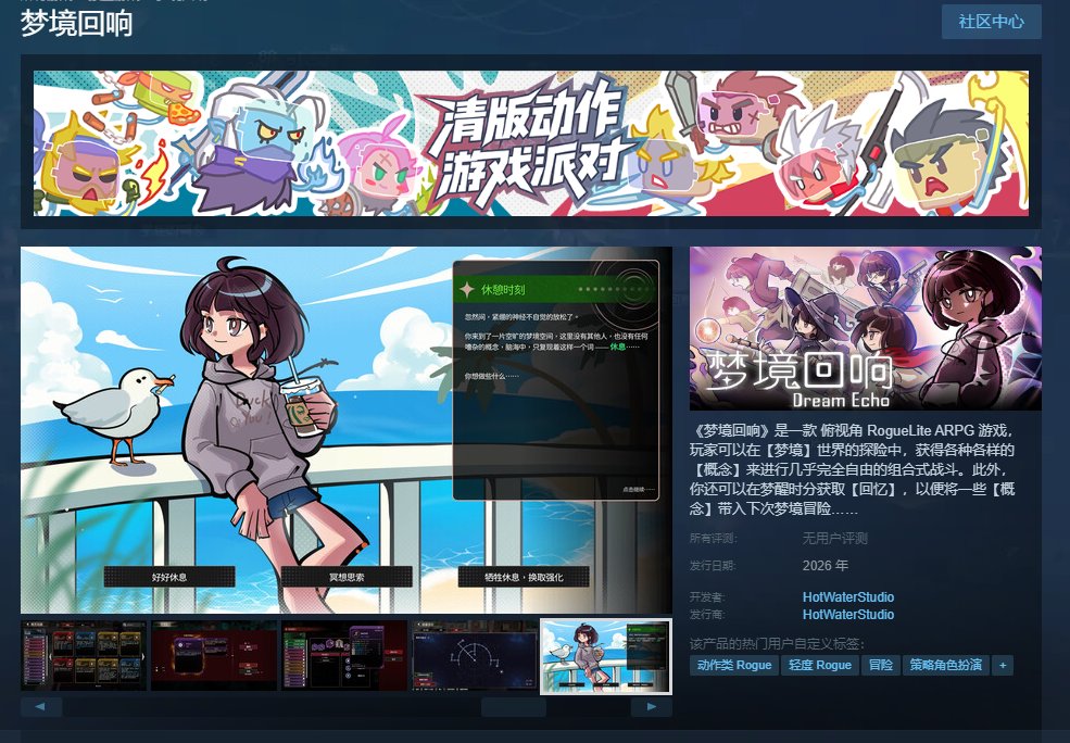 《梦境回响》是一款有肉鸽元素的横版APRG。制作人是POE(流放之路)的发烧粉,本作的核心乐趣就在于武器+技能+能力的构筑。构筑通过代码分享给其他玩家。玩家还能教制作人玩游戏。坐等游戏大佬的作业和轮椅阵容。