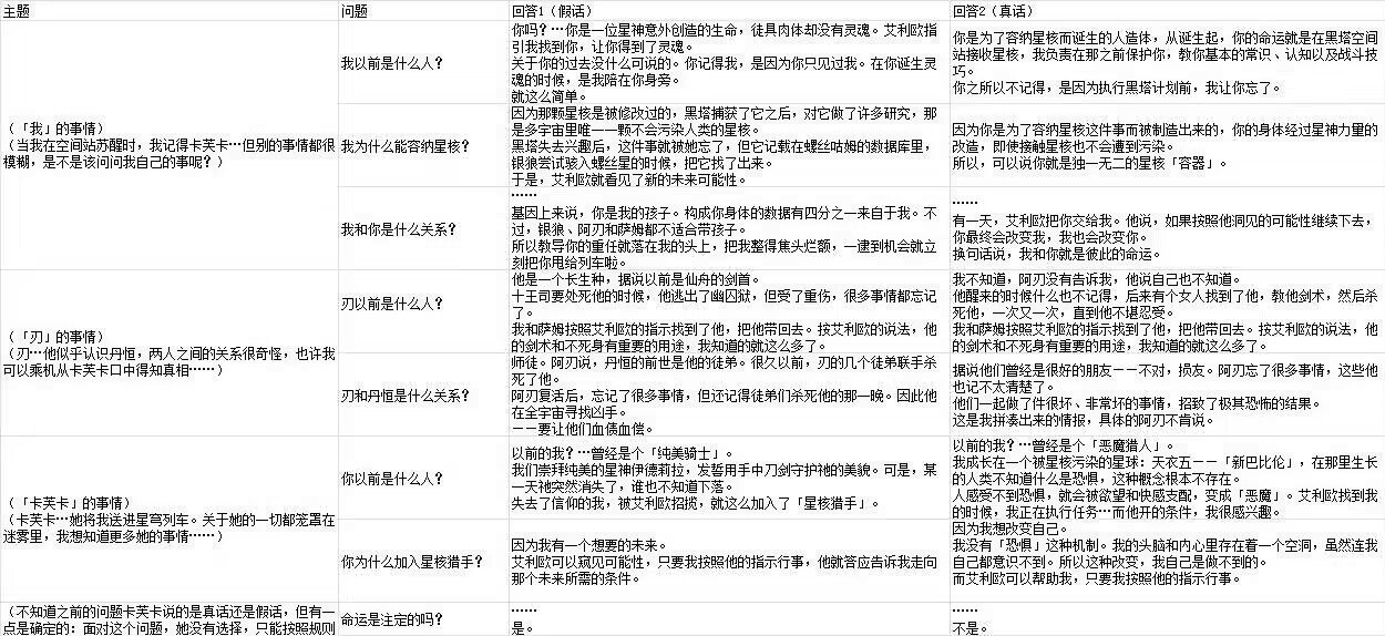 對應的真話是:開拓者是“爲容納星核而被製造的人造體,身體經星神力量改造,是獨一無二的星核容器”,且卡芙卡負責了開拓者的前期保護與教導。