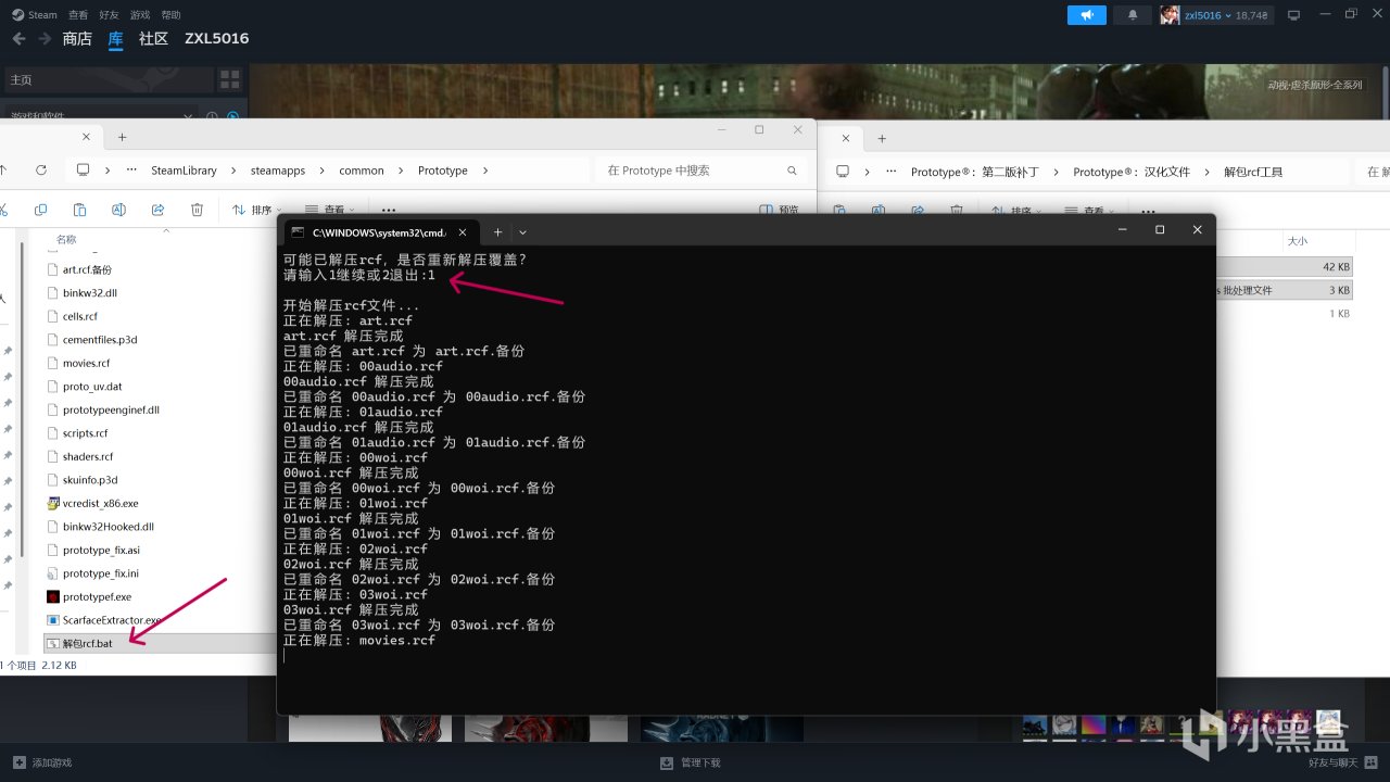 第六步:双击解包rcf.bat工具,输入1继续,等待自动解包完成。