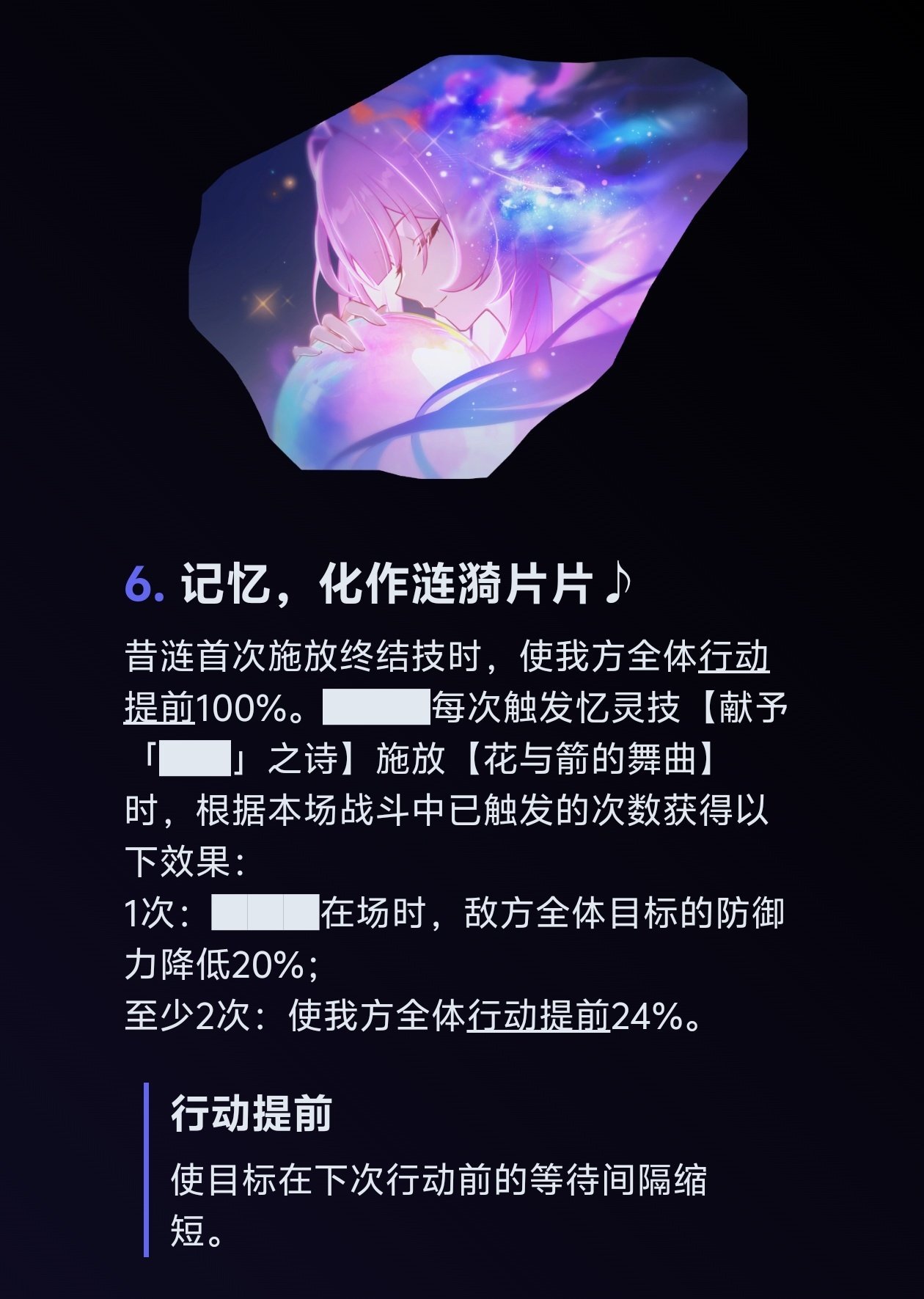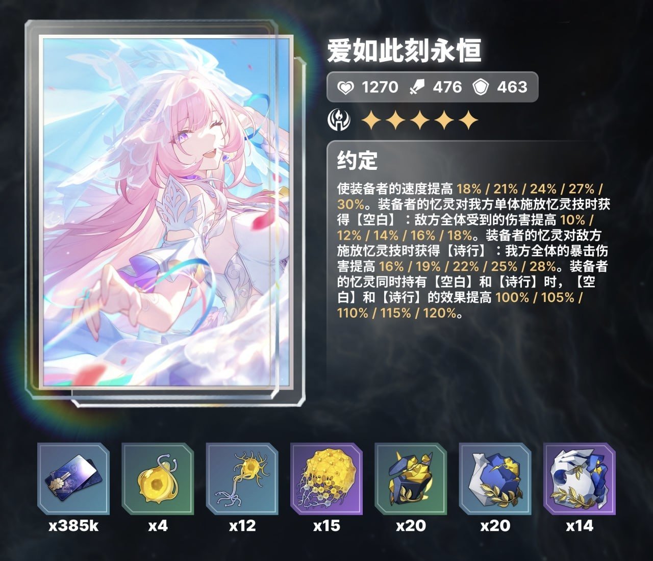 首選“愛如此刻永恆”,能附加18%速度和一套對單體/全體互補的狀態增益,兩個狀態同時存在時效果翻倍 。