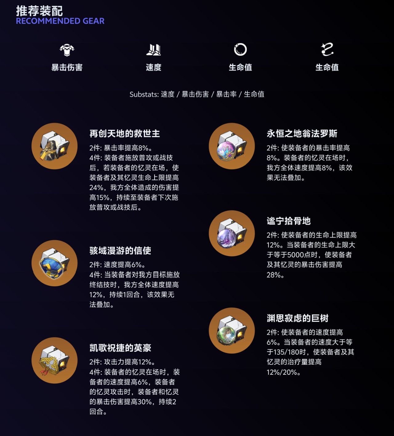 外圈首選“再創天地的救世主”,衣服主詞條選暴擊或暴擊傷害,鞋子主詞條選速度。內圈選“永恆之地翁法羅斯”,繩子主詞條選生命值,球主詞條選冰屬性傷害或者生命值(哪個副詞條好選哪個),副詞條優先生命和速度。