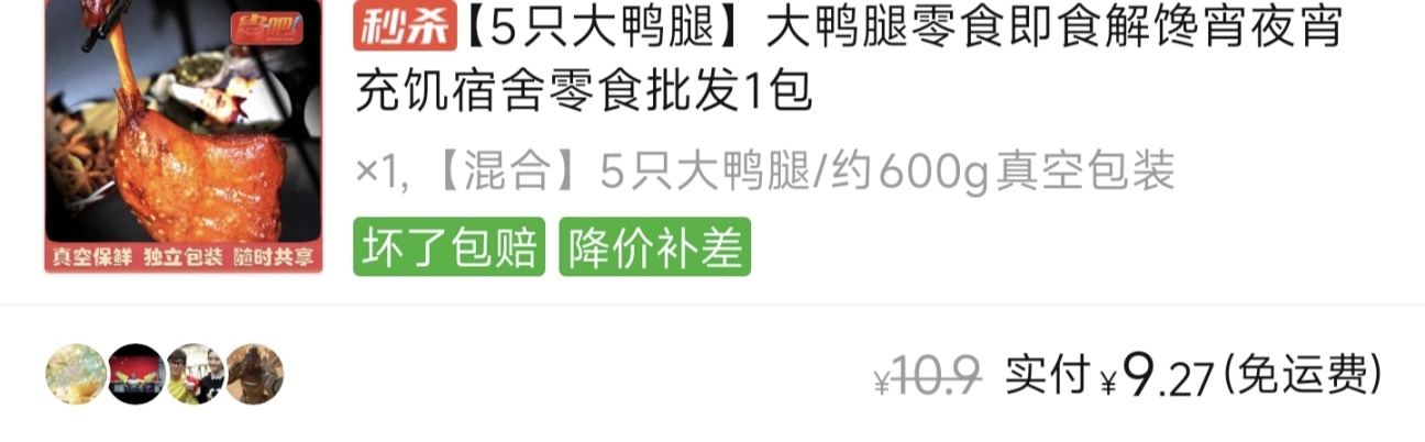 9.27五只大鸭腿,比巴掌略小一点,但毕竟配料表第一位就是鸭腿,性价比还是没得说的。
