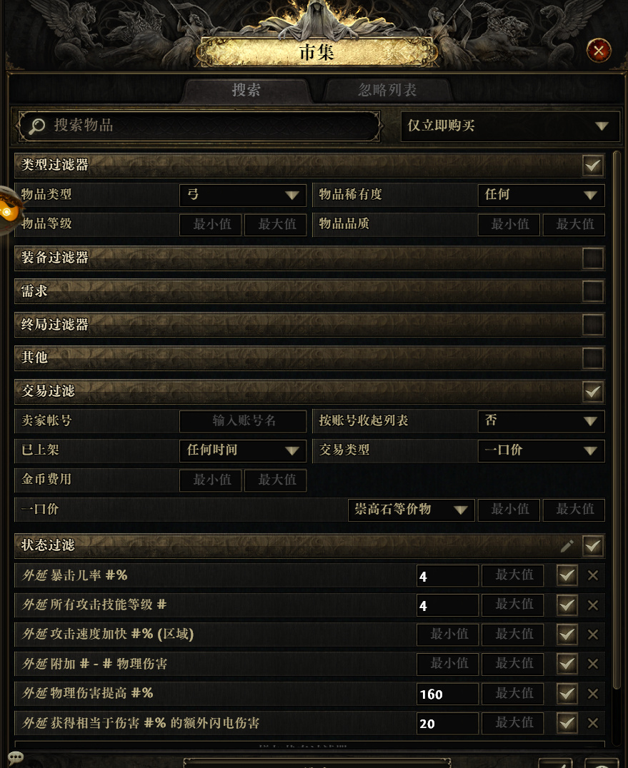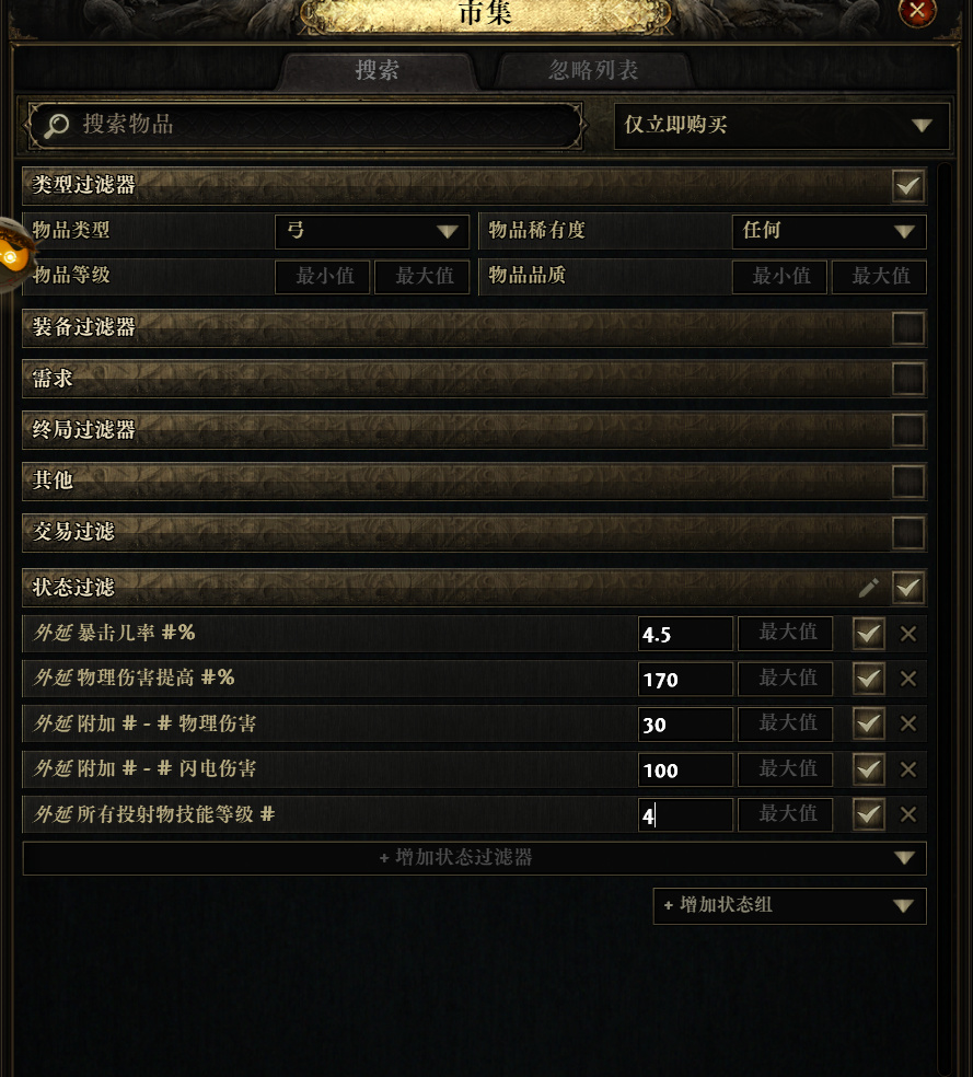 箭袋搜索贯心箭袋,状态过滤投射物技能+2和弓类伤害技能提35+,这两个最重要,尤其是投射物技能+2,其他可以加的筛选条件有附加额外闪电伤害,投射物速度加快。