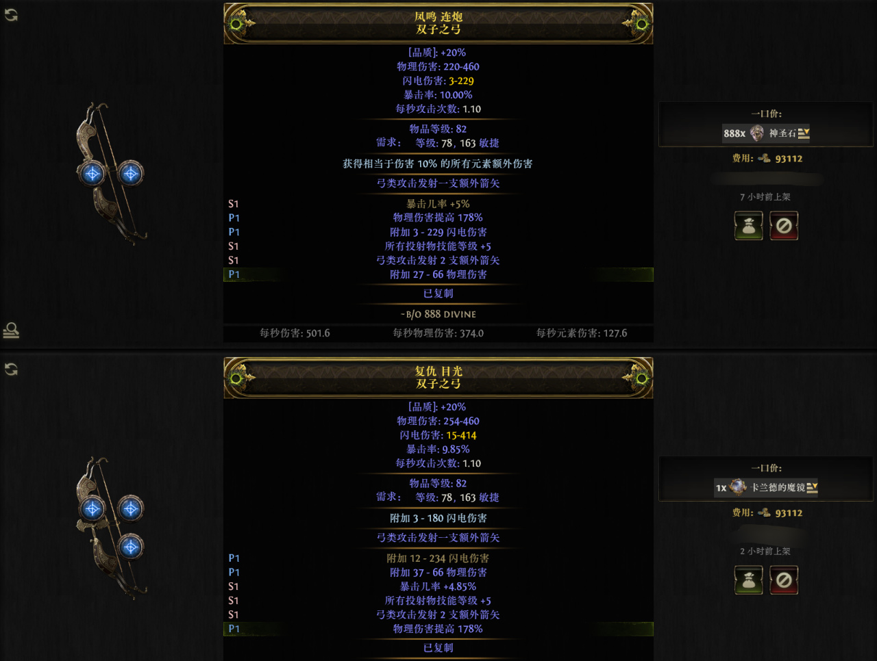降低词缀数值和更替一些词缀过后,价格就来到了100D以内,这是绝大多数玩家都能达到的配置,伤害也够用了。孔位和符文再降低一些要求,价格在20D以内就能拿到一把能用的弓,这就是锐眼玩家体量大的好处,买弓比自己做弓还要便宜的多。