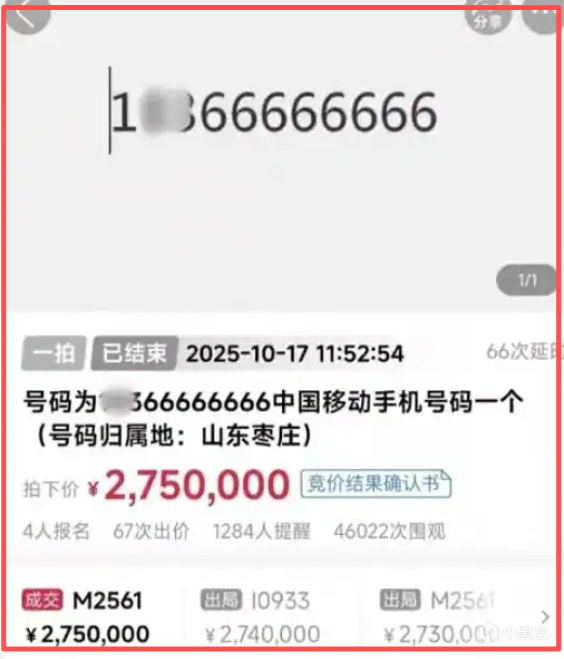 刚过去的 10 月 17 日,一个尾号为 66666666 的中国移动手机号在拍卖中以 275 万元高价成交,这个价格比 200 万元的起拍价高出了 75 万元。