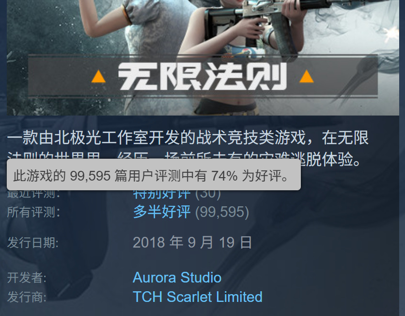 但就在這種環境下,卻有一款貨真價實的國產PC射擊遊戲登陸了Steam,在整個生命週期裏,收穫了近10萬個Steam評價,好評率最終定格在74%。這個遊戲就是北極光的《無限法則》。