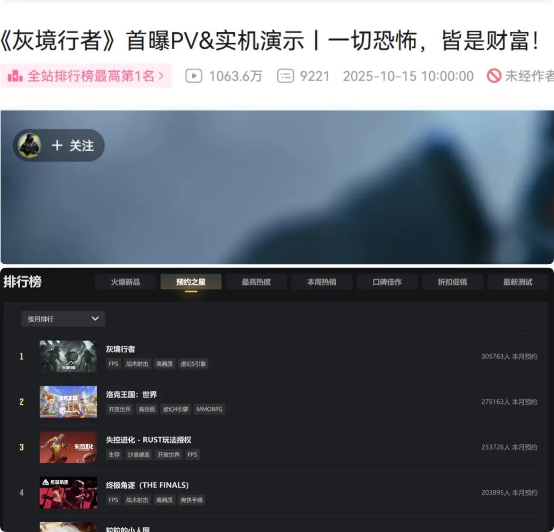 10月15日,騰訊交了一張最新的答卷:PvEvP獵殺奪寶,並採用了無限流微恐題材,名爲《灰境行者》。PV和實機演示公佈一天,B站全站排行榜第一名,接接着又達到了wegame預約榜月榜第一,Steam全球免費新遊趨勢榜榜一。