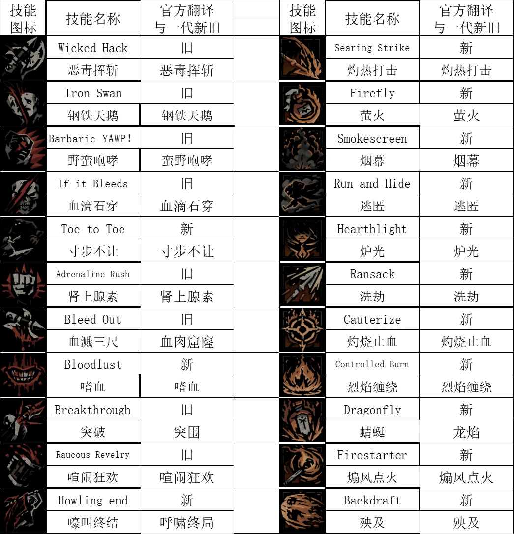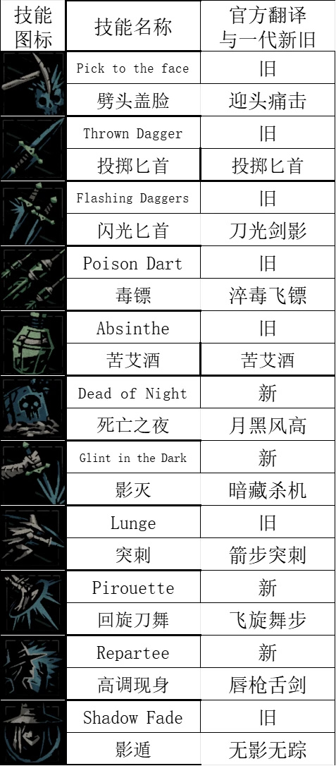 再看《暗黑地牢2》新翻译不顾老玩家已经熟悉的技能名称,非得自我创新(初版),弄出了诸如刀光剑影,月黑风高这类颇具武侠风格的翻译,甚至道途Dead eyes(原意神射手,大伙儿叫死眼),被翻译成了“穿杨客”取百步穿杨之意。