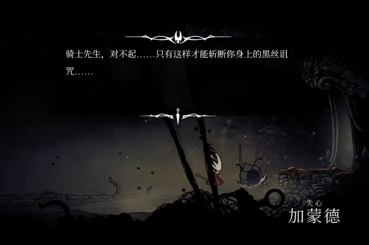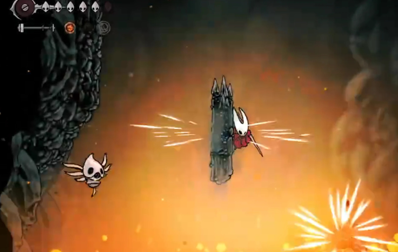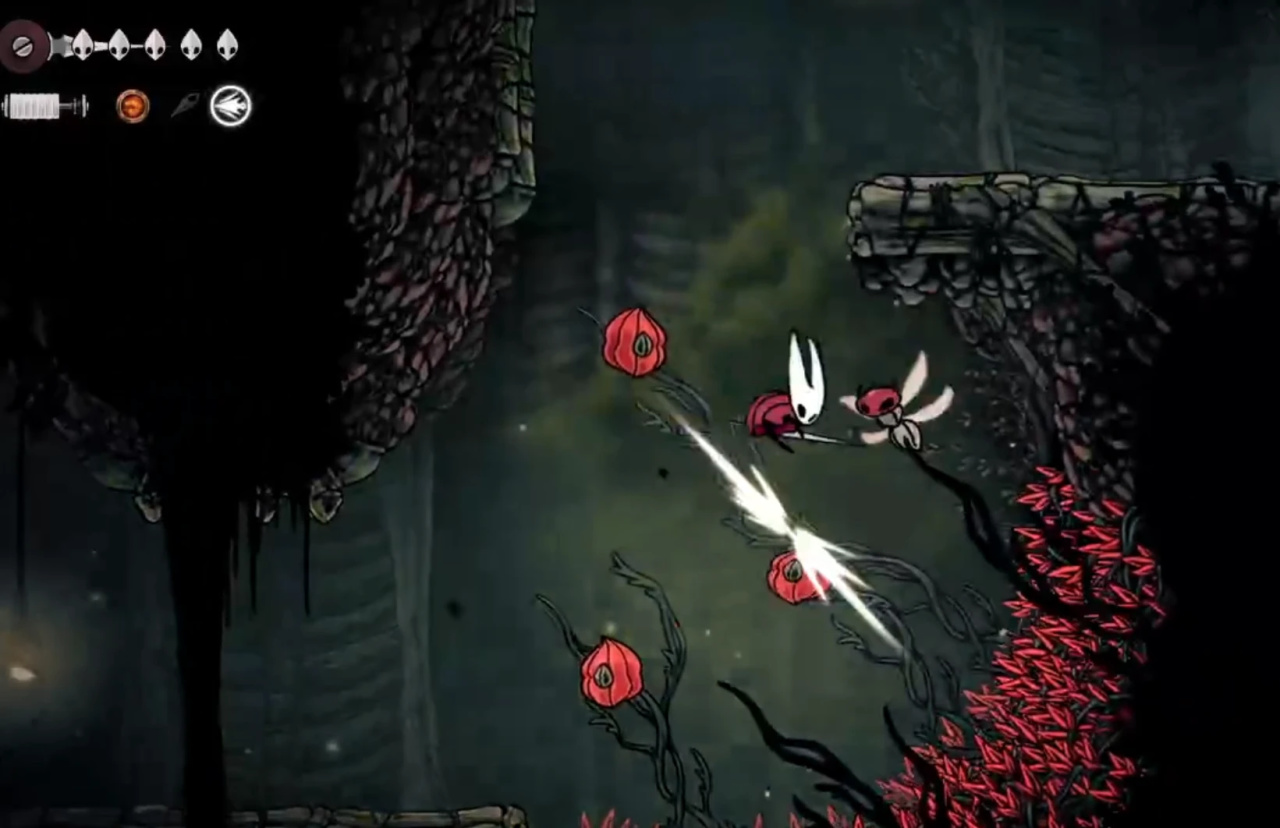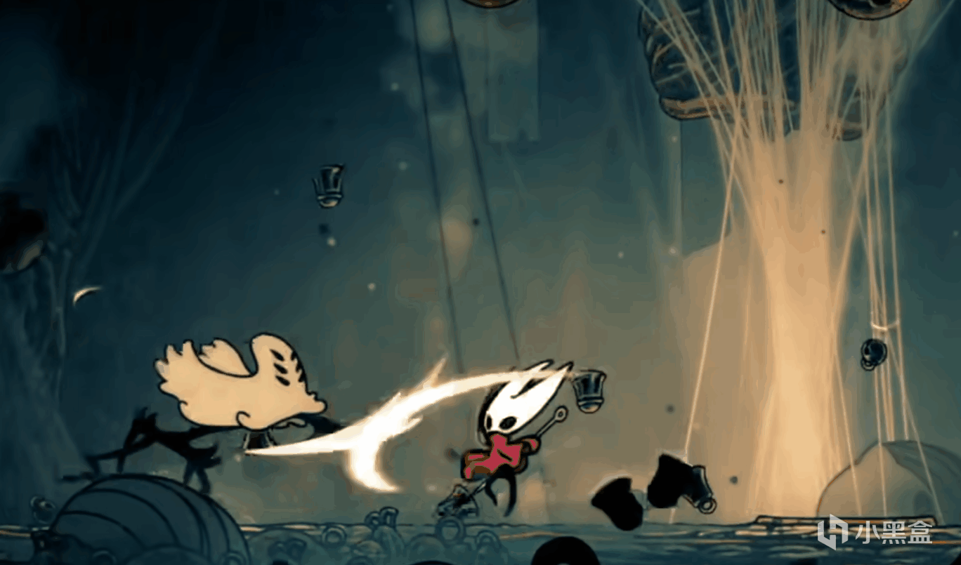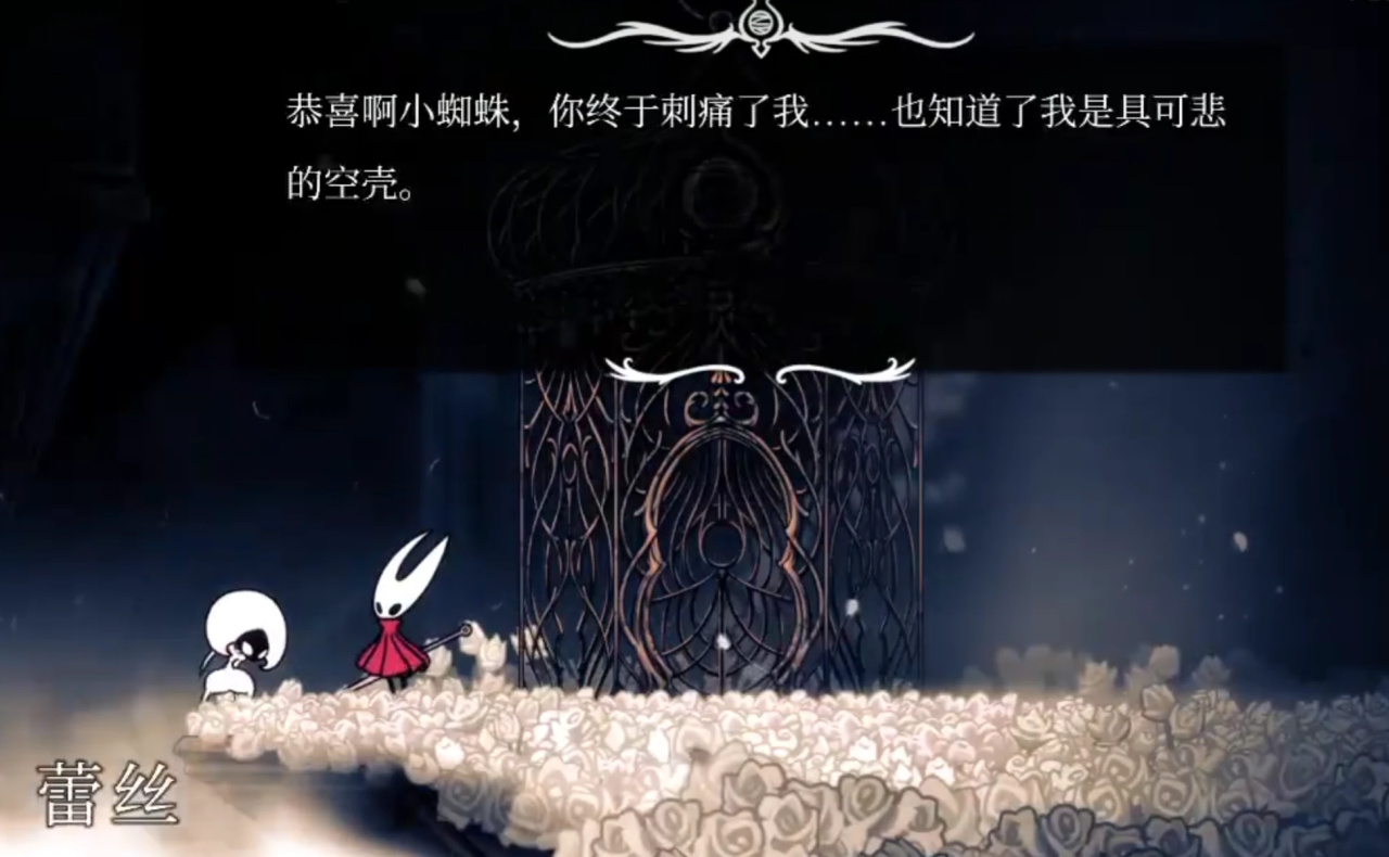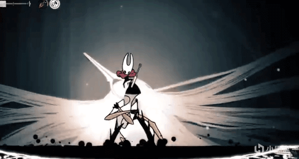 你可以理解为小骑士的花是在他受伤时,被他体内的虚空之力震碎的。而这张动图,其实也描述了另一个事实,就是在《空洞骑士》本体里,拼刀确实比《丝之歌》难……