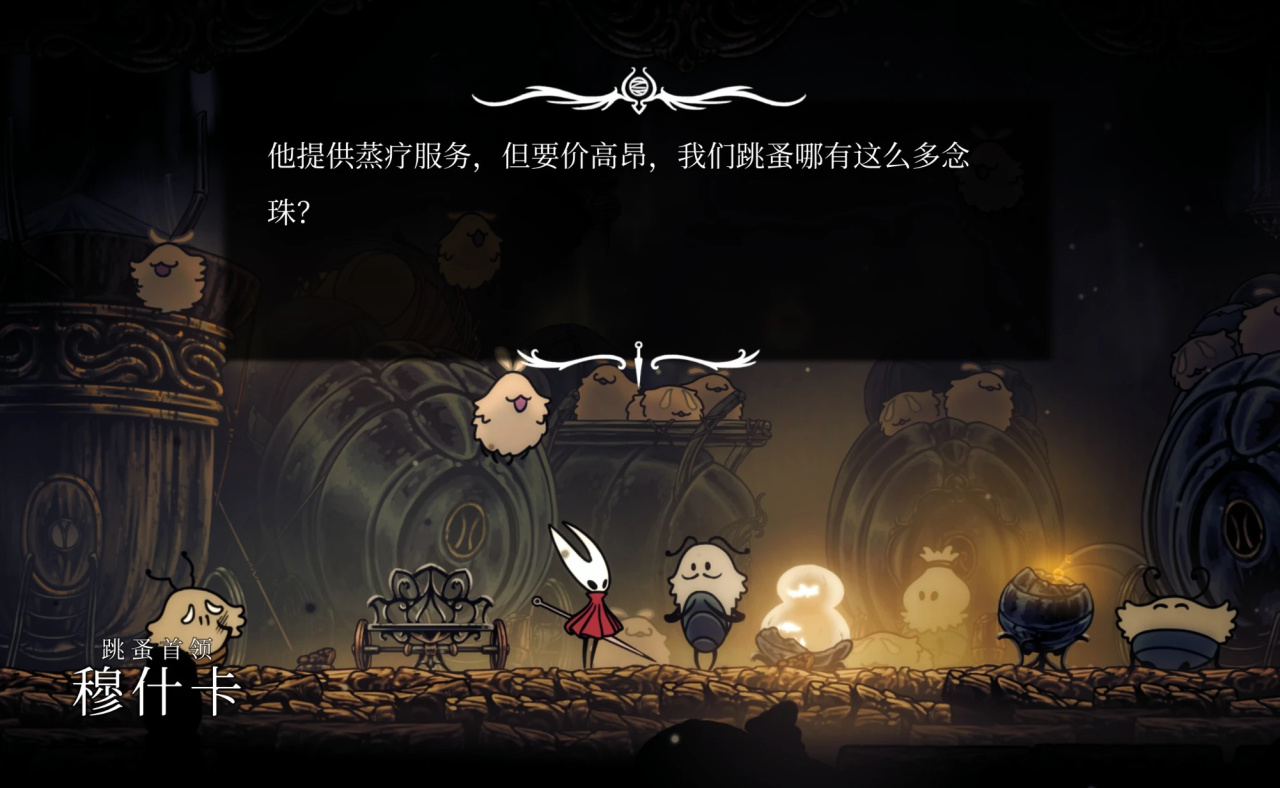 在遇到绘图师沙克拉第一个商店后,玩家需要折回骸底镇区域上方绕行,这里会有许多被丝母控制的朝圣者。这也是玩家首次遇到可以掉落念珠的怪物。此前与沙克拉的对话,也介绍了这些被控制的朝圣者似乎疯了,降低玩家击杀它们的心理负担。