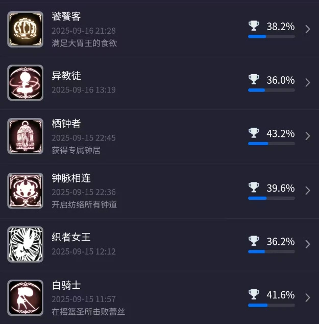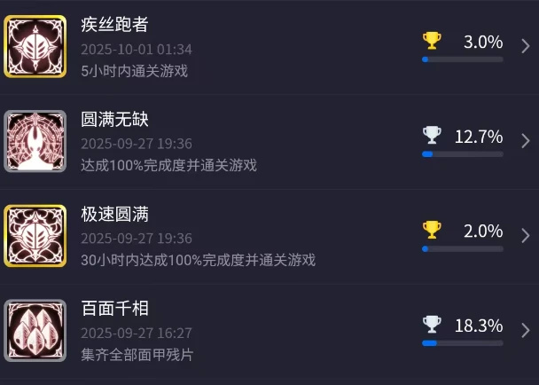 未完成的成就包括猎人记痕、旧纪终焉,这两个成就纯嫌麻烦。另外两个钢魂的成就,是死一次就碎档,这个我水平确实不够,又不想通过各种Alt+F4,备份档案、下载档案的手段硬去凹一个全成就给别人看,所以也没弄。