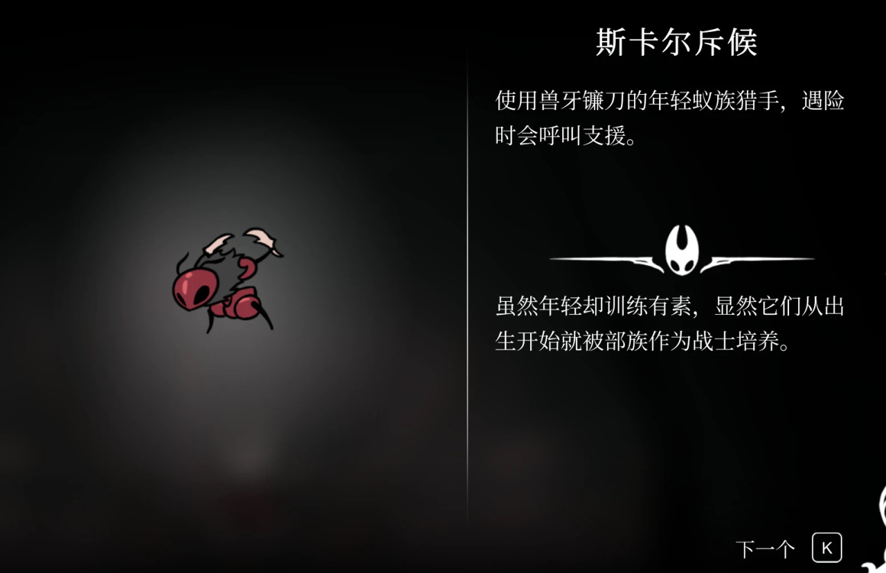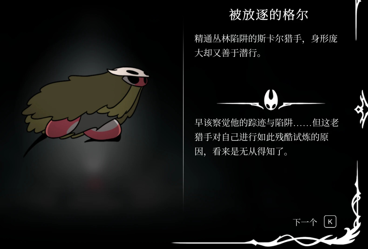 第二只蚂蚁,是给我们回旋镖升级的,也是独自出现。最后是一个隐藏Boss被放逐的格尔。通过它们的境遇推断,或许红蚁部落会将皮肤带有白色这一点,视为某种不祥,并对这些“白蚁”进行追杀。或许这与丝母的咒丝颜色也是白色有关。