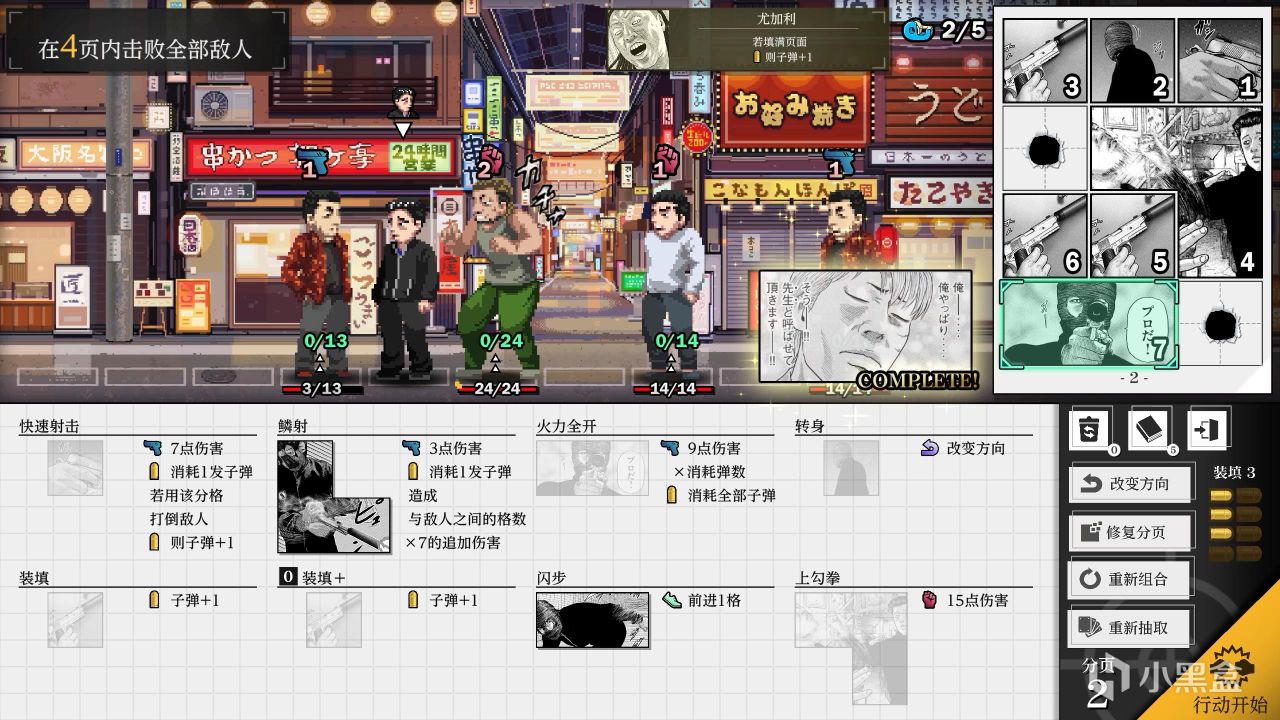 比较有意思的系统是,本作战斗失败的判定是根据漫画分页的页数,玩家一共有五页分页可用,如果五页内没能击杀掉所有敌人就直接失败,并且本作没有血量系统,玩家受到的伤会变成分页上的窟窿,让玩家在填充分镜时受限。