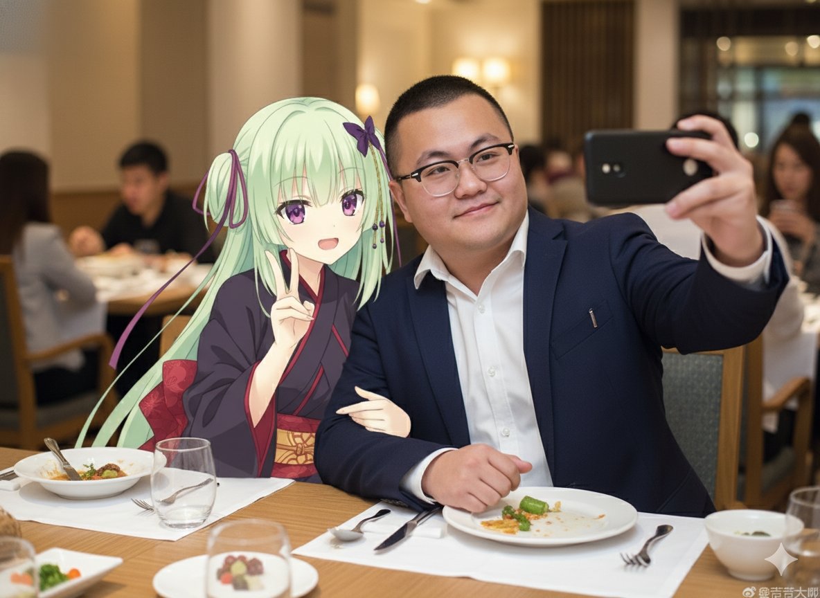 提示词1:把第一张照片的男角色和第二张照片的女角色单独提取出来,把他们放在一个餐厅里面并排坐着吃饭。视角是右边的男角色拿着手机内侧摄像头自拍,男主在旁边看向摄像头,女角色靠着男角色,女角色一只手挽着男角色的手臂,另一只手对着手机摄像头比耶,女角色也看向手机摄像头。男角色和女角色面带微笑,光线符合逻辑。
