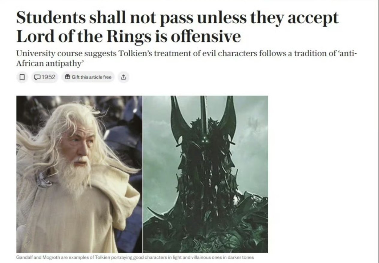 据《每日电讯报》报道,英国诺丁汉大学近期开设的名为《去殖民化托尔金及其他》(Decolonizing Tolkien et al)的课程指出,J.R.R. 托尔金在其经典著作《指环王》中“妖魔化了有色人种”,作品中的半兽人及其他深肤色角色被视为“种族沙文主义”的受害者。