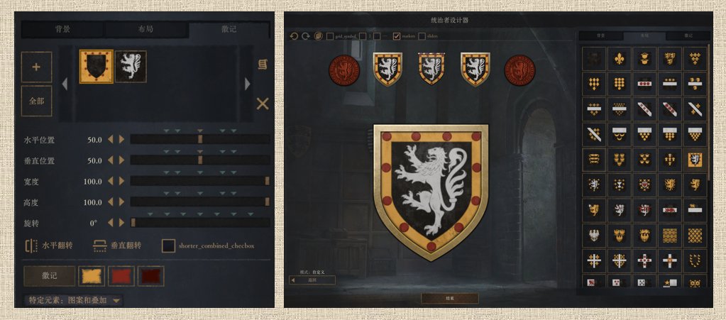 第一个是纹章编辑器,相比于原版,它更加方便,旋转、反转等操作可以直接点下面预设的参数