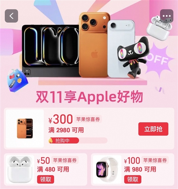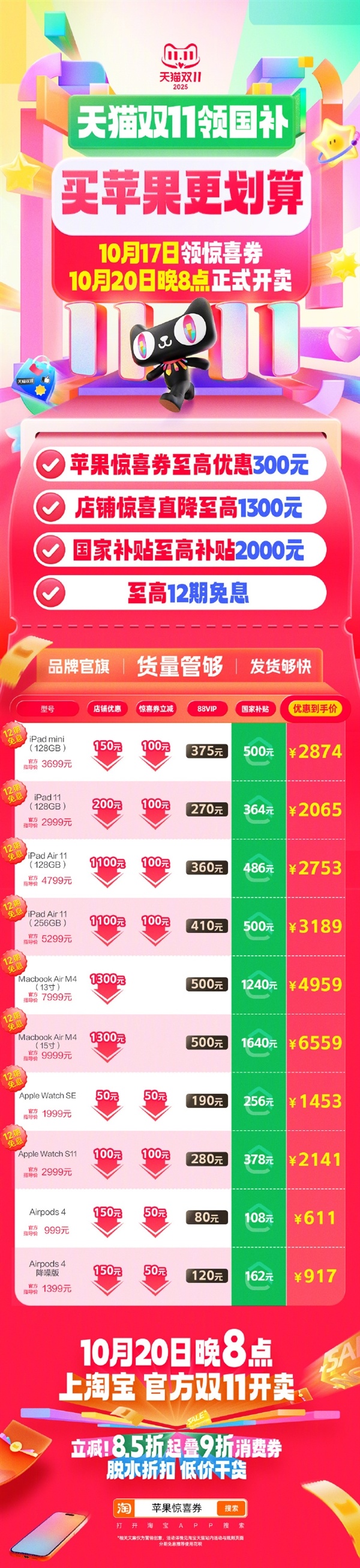 快科技10月20日消息,天猫Apple Store官方旗舰店双11活动将于今晚20:00开启,iPhone、Apple Watch、iPad、MacBook Air、AirPods等多款产品迎来降价。