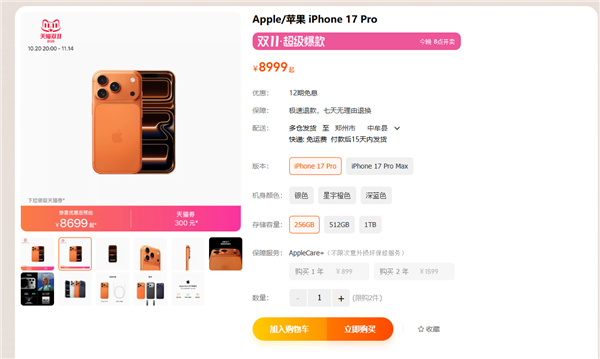 据了解,iPhone 17 Pro系列可领300元优惠券,iPhone 17 Pro券后到手价8699元起、iPhone 17 Pro Max券后到手价9699元起。
