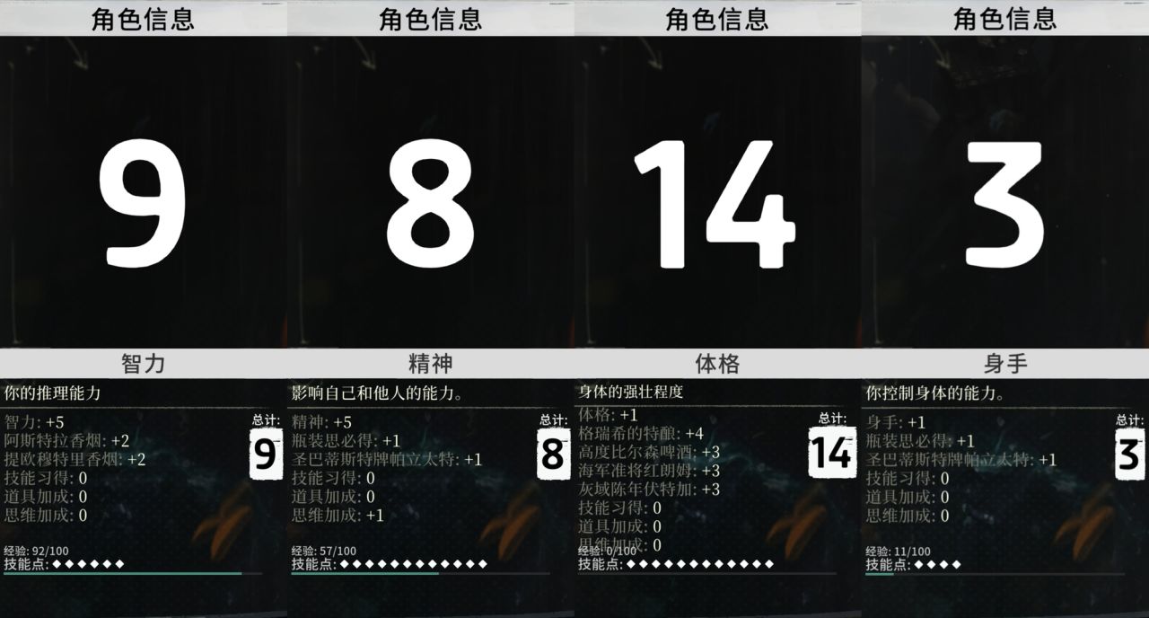 *特別注意需要在體格屬性先全部達成後,再內化完成「現實的荒原」思維,該思維內化完成後使用酒精無效。