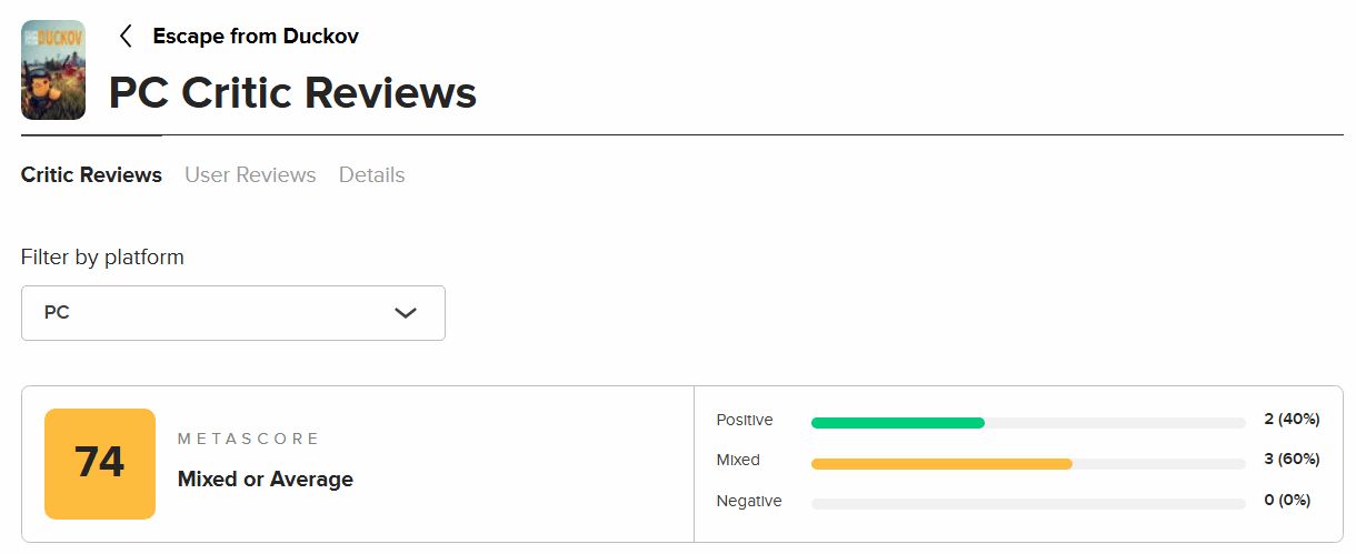 知名評分網站MetaCritic彙總了5家媒體對《逃離鴨科夫》的評測,其中僅2家給出好評,3家給出差評,均分爲74分。這款由碳酸小隊開發、bilibili遊戲發行的鴨子題材PvE俯視角撤離射擊遊戲於10月16日發售後,因其親民定價和可愛畫風受到關注,但玩法深度不足成爲多數媒體批評的焦點。