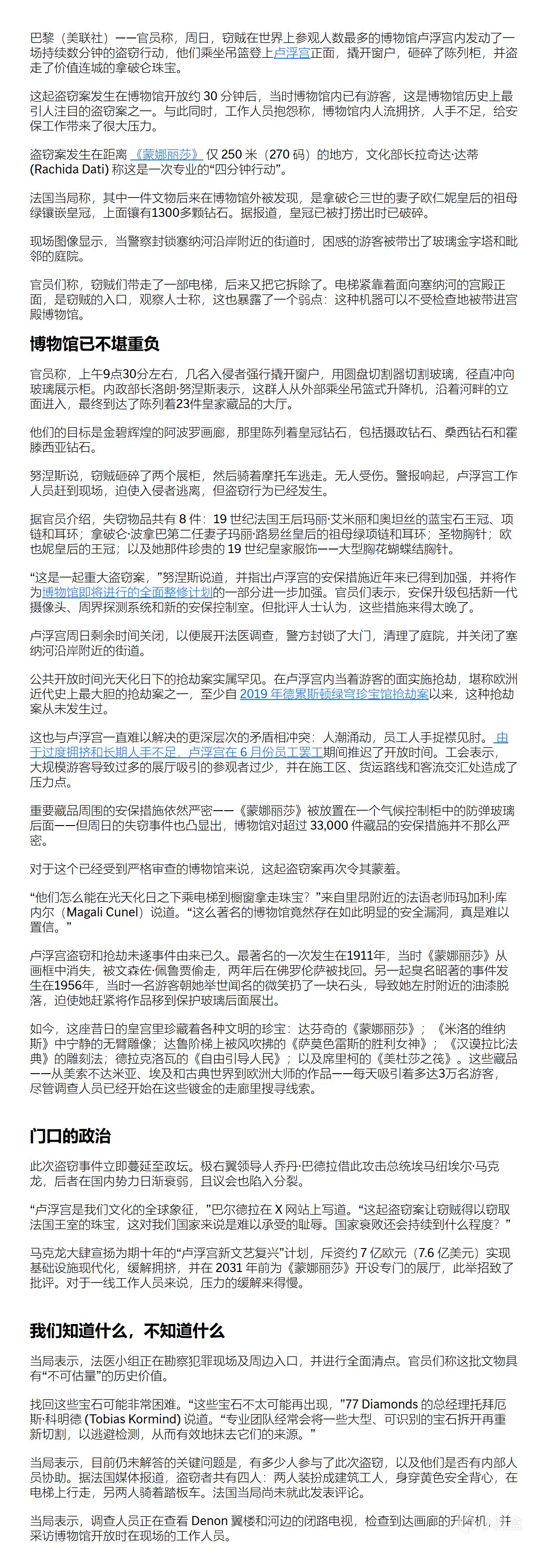 周日,窃贼在世界上参观人数最多的博物馆卢浮宫内发动了一场持续数分钟的盗窃行动,他们乘坐吊篮登上卢浮宫正面,撬开窗户,砸碎了陈列柜,并盗走了价值连城的拿破仑珠宝。