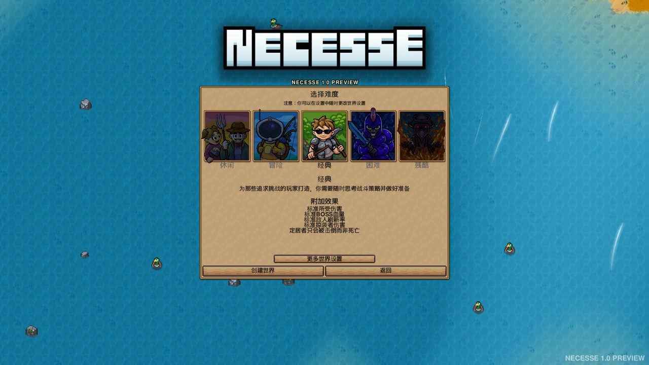 在生存体验上,游戏内也提供了贴心的难度保护自定义选项,包括但不限于死亡后不掉落物品、入侵者刷新频率以及整体难度等自定义环节。
