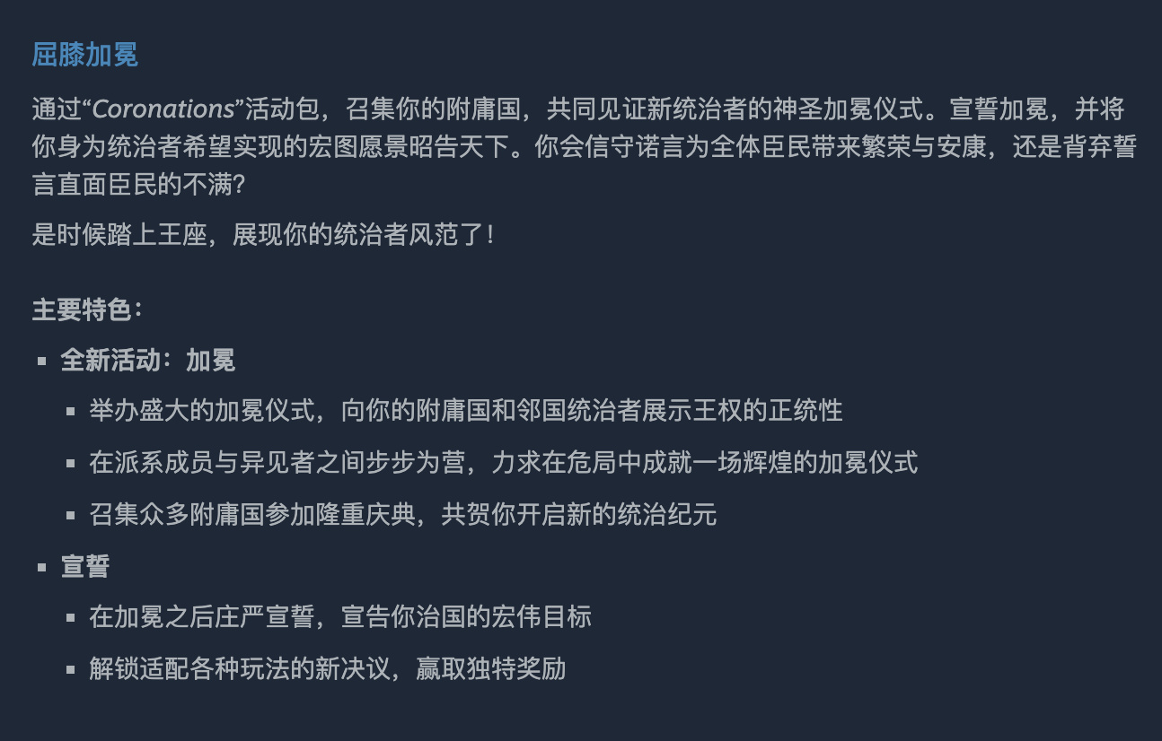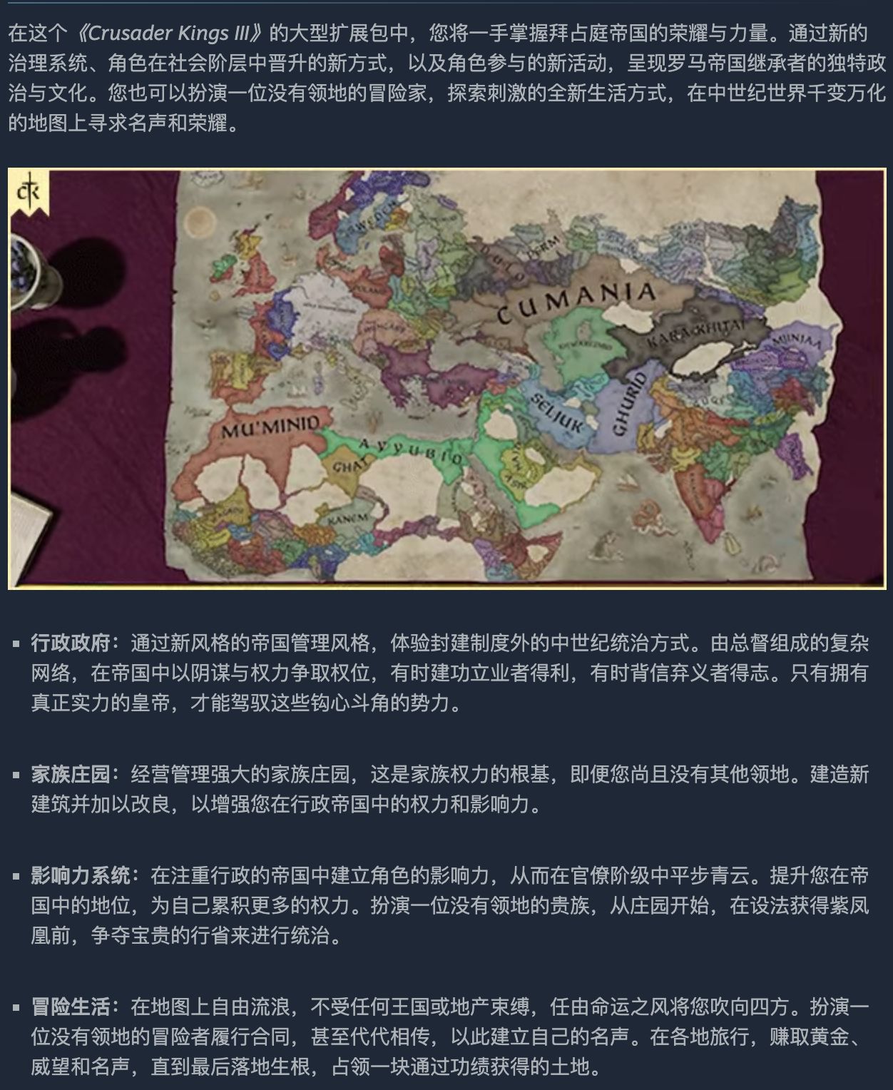 而本篇则是介绍ck目前发行的dlc,从而了解这些dlc的水平如何。