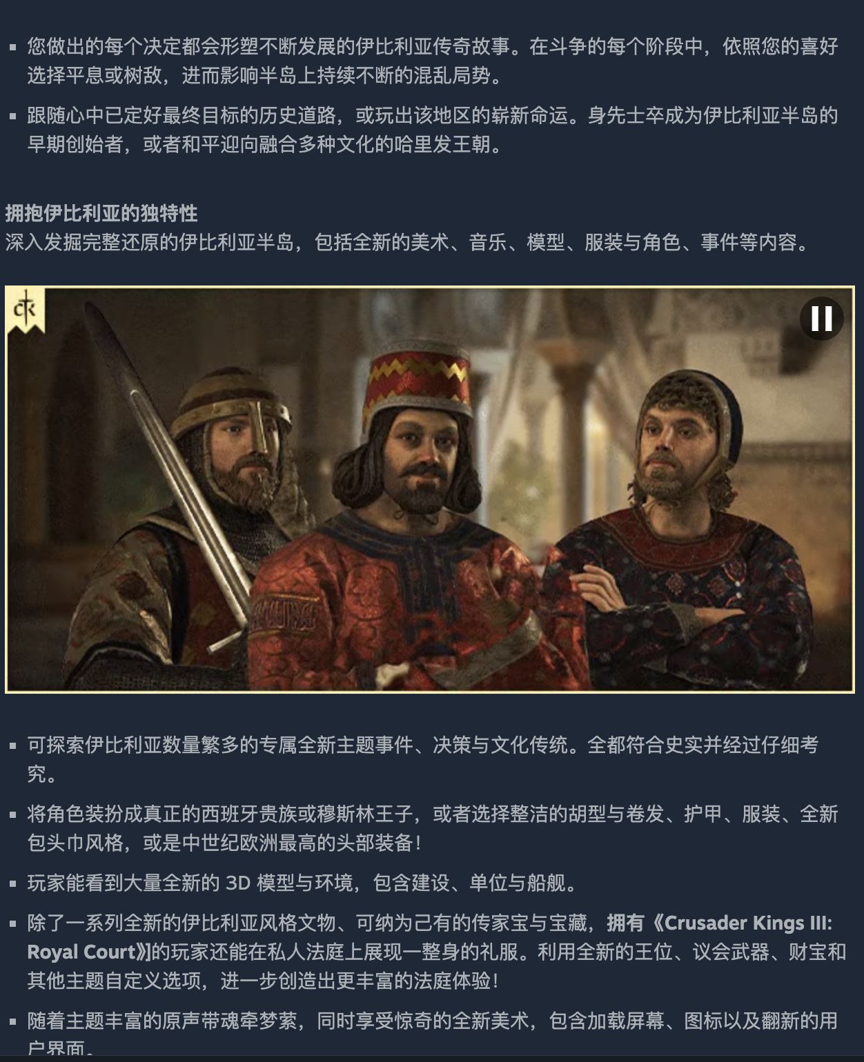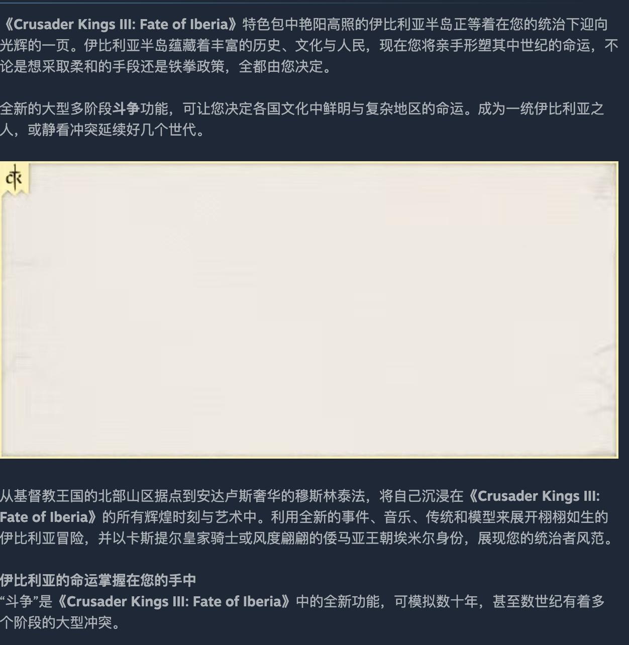 由于p社的主力是西班牙组,所以第二个风味包则是伊比利亚的命运,作为十字军之王中相对重要的伊比利亚地区,p社采用了一种叫做斗争的系统。然而这个斗争在伊比利亚可以说是一言难尽,合理性和游戏性都没有的东西,个人观点是感兴趣的可以入,不感兴趣的,原版机制也够用了。